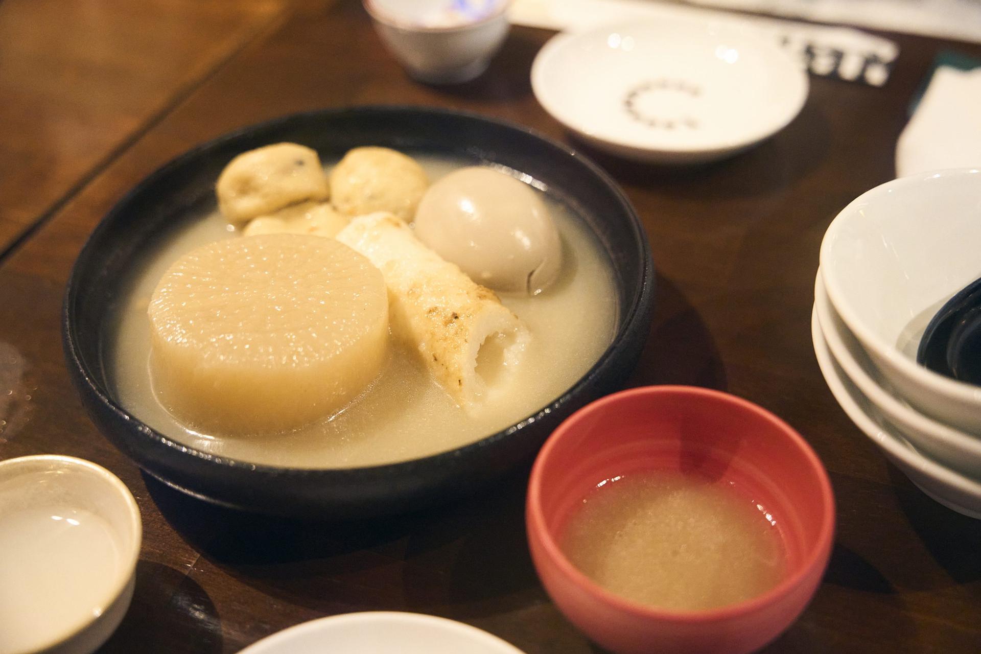 ほっと一息をつける牛だしおでん居酒屋。本格的なクラフトビールから日本酒まで、お酒のラインナップも様々。おでんに合わせて好きなものをセレクトしたい。前回の鍋に続いて、おでんも年中お酒のアテになる! 大根(385円)、がんも(330円)、半熟卵(330円)、きりたんぽ(418円)。
