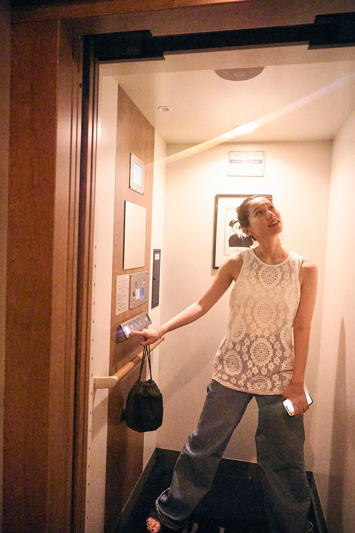 専用エレベーターで4階へ。エレベーターの中にもバーのデザインが施され、テンションアップ。