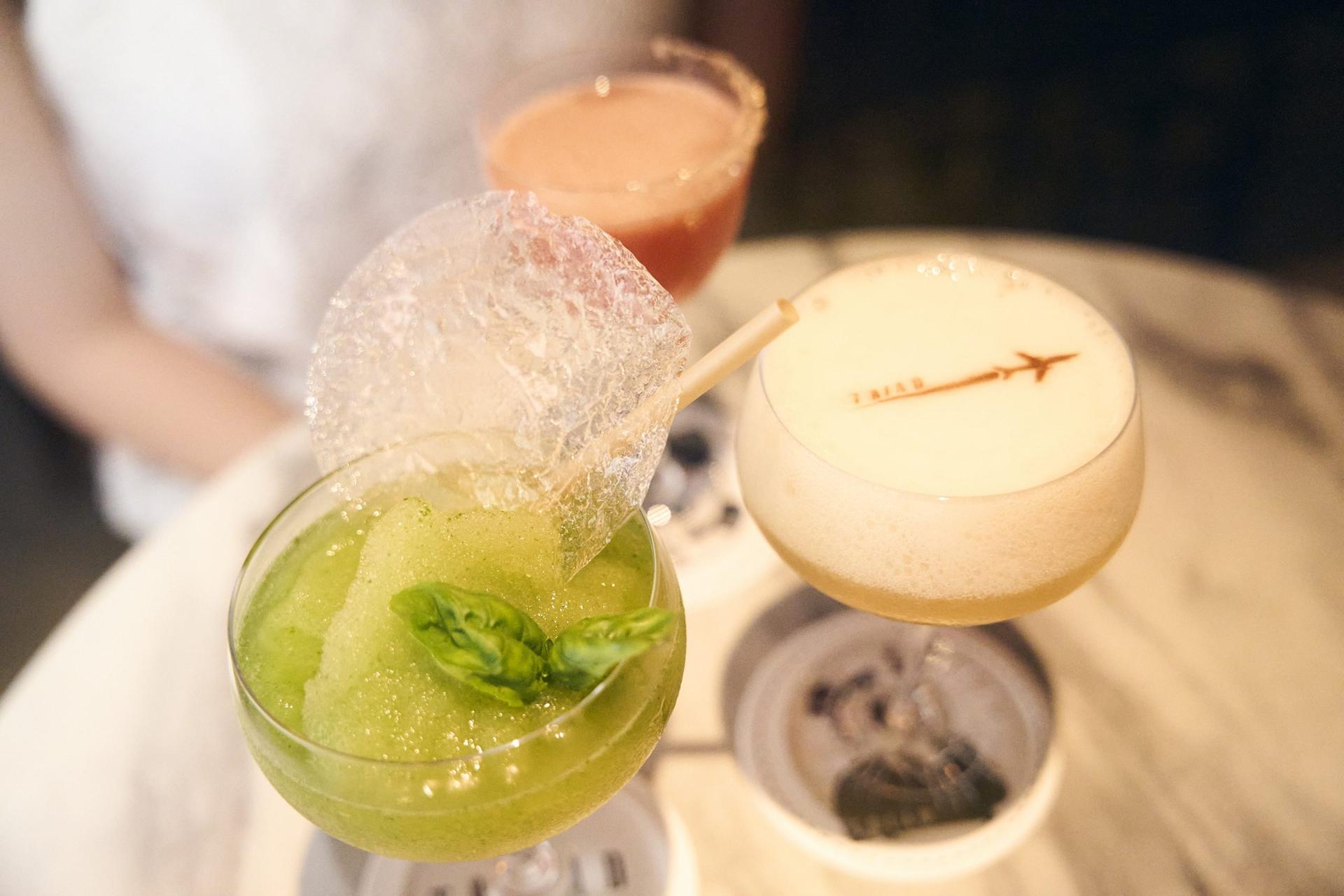 手前から時計回りに、バジルとリモンチェッロのフローズンカクテルの、グラニータ ジェノヴェーゼ(1650円)。夜間飛行を模したプリントが施され、りんごのお酒とカモミール、ジャスミン茶をブレンドした、オーバー ナイト デリバリー(1700円)。アールグレイのリキュールとラズベリー、グレープフルーツを合わせたフルーティーな味わいの、ベリー スロー ステップ(1550円)。