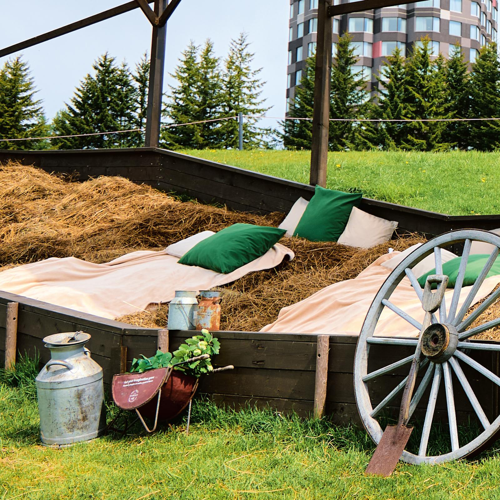 ファームエリアに足を踏み入れると、そこかしこで牛や羊が気持ちよさそうに草を食みゴロンとお昼寝。牧草ベッドやハンモックに身を任せれば、動物たちと青空の下でリラックスタイム。牛柄のカートに乗り、広大なファームをゆったりと巡るのもいい。