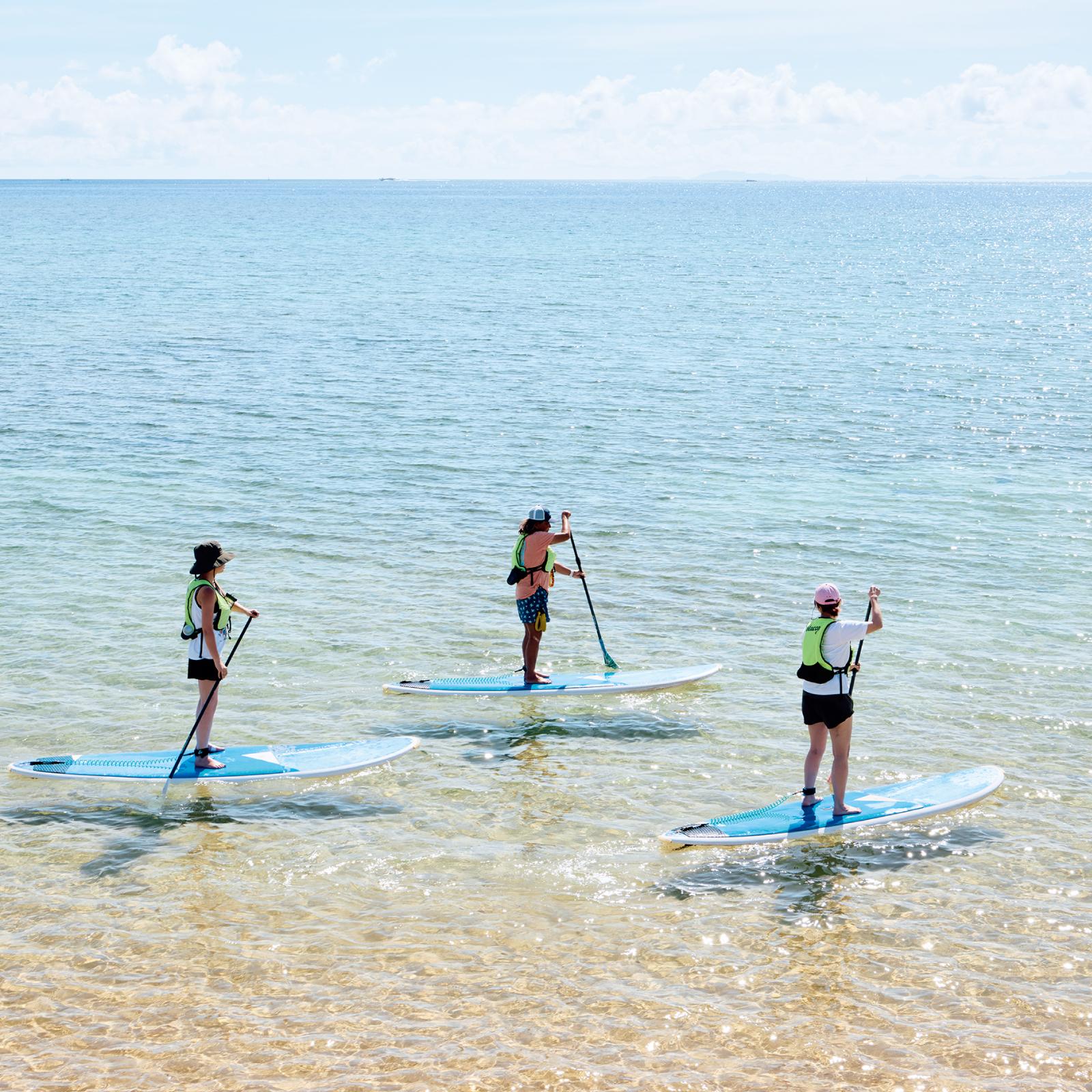 これぞ西表島! を体験できる、充実した「西表島ホテル」のアクティビティ。上・初心者でもトライしやすいSUP。空も水面もオレンジに染める夕日の中で行う「サンセットSUPクルージング」(90分 ¥8,000)は特別な思い出に。