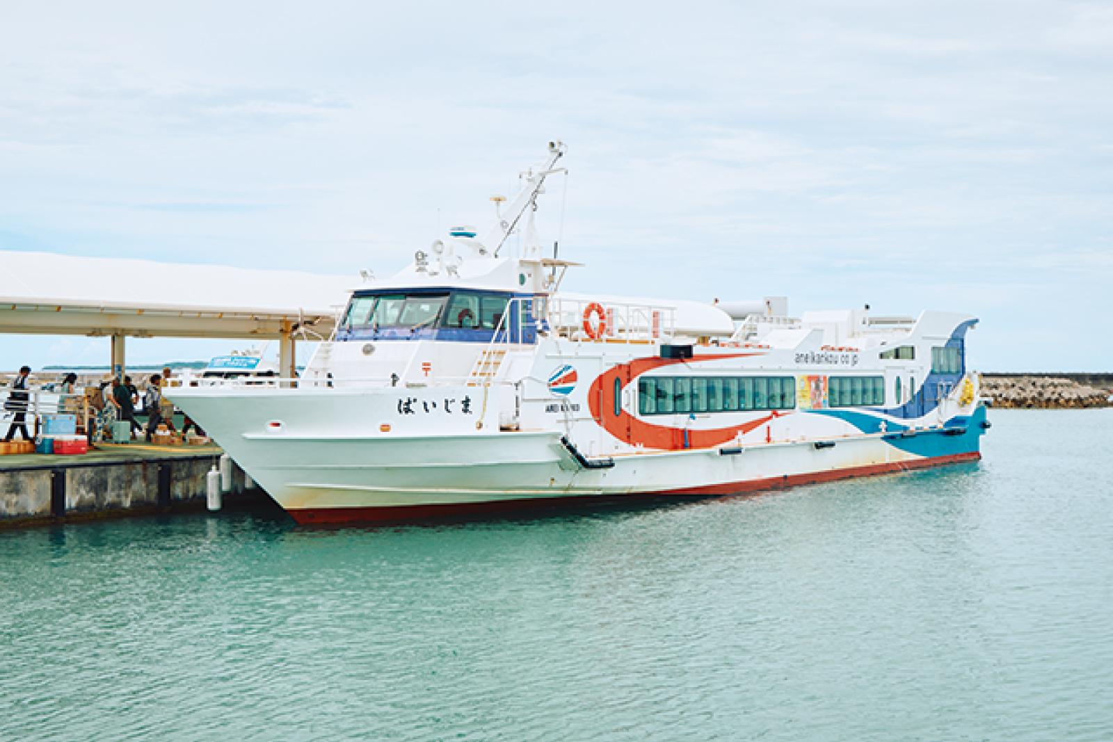 西表島へは石垣島まで飛行機で行き、フェリー(2社から発便)で約45 分。主に西表島の上原港に到着するが天候により大原港にも。事前にオンライン予約をし て、運行情報をチェックしておくと安心。