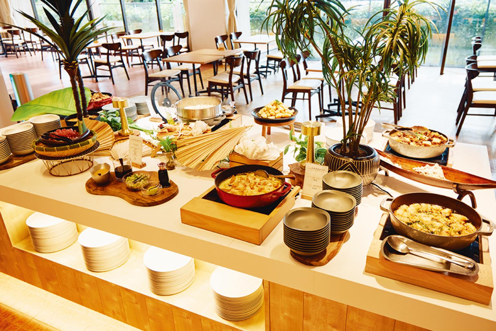 朝晩の食事はビュッフェ。夕食には沖縄らしい食材の料理が約60種並び、ライブキッチンでは“西表の日”と“アジアの日”のメニューを日替わりで提供。プールサイドでドリンク(¥1,000~)を楽しめる「イリオモテトロピカルサマー」にも注目。