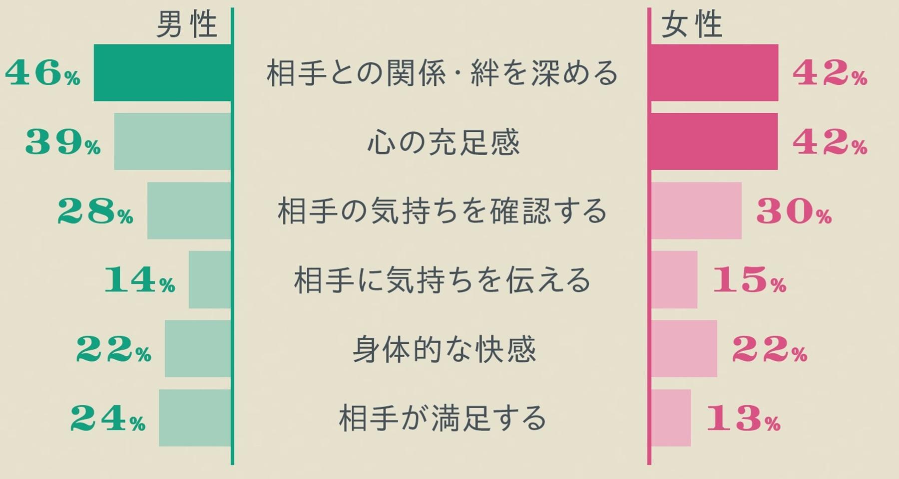一方で、[パートナーとの関係を続けるうえでセックスは必要]と答えた男女は各60%以上に上り、理由の多くを愛情表現や心を満たすためといった内容が占める。合田さんは「動画、SNS、ゲームに読書と、各自が自由にスマホなどのデバイスで楽しめる現代。だからこそ、画面から目を離し、外の世界ではなく相手だけに集中できる時間は特別に感じられ、繋がりを深める大切な時間として重視されるようになってきたのかもしれません」と分析する。