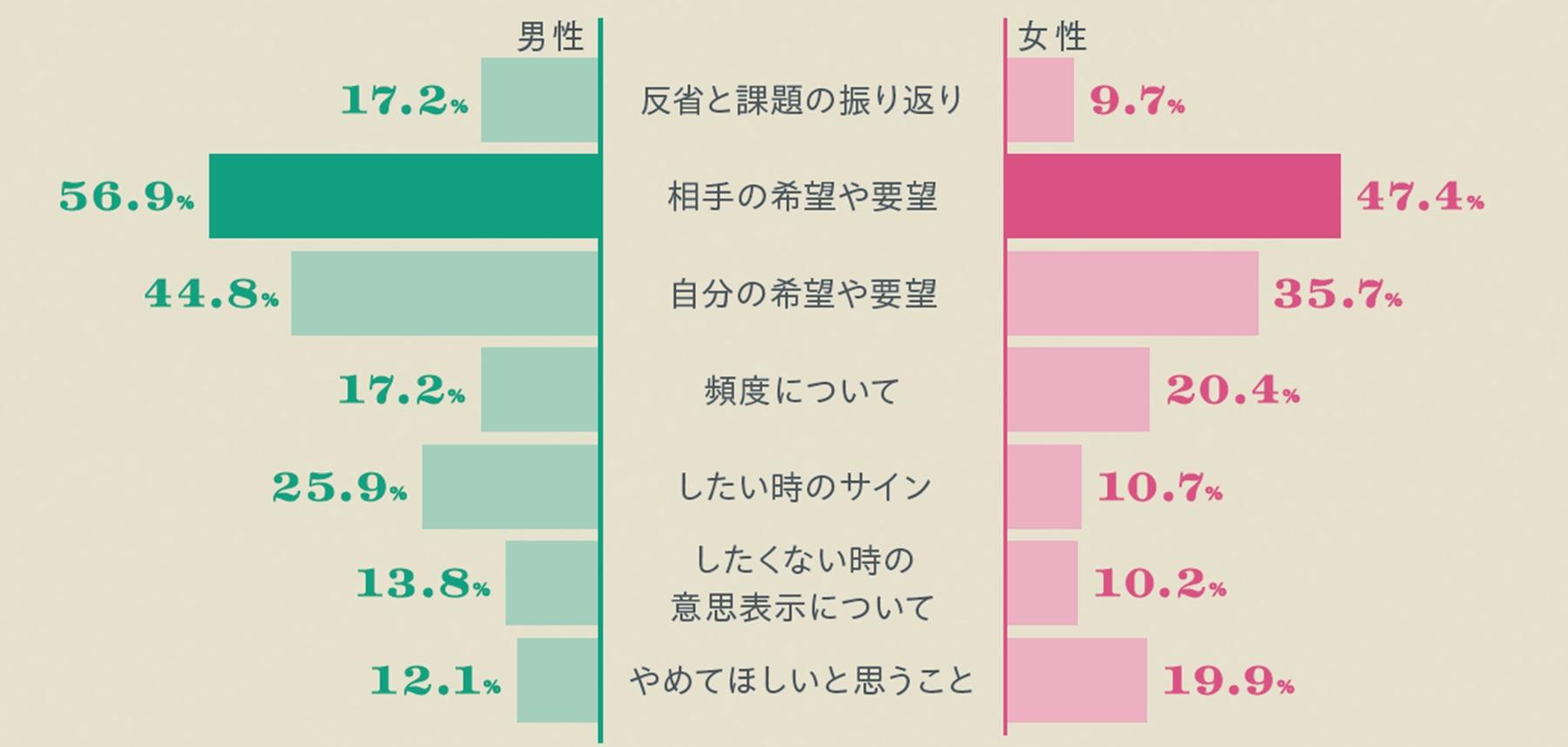 「[パートナーとセックスについて話さない]という女性が半数近くいるのは印象的」だと合田さん。[相手の希望や要望]を聞き[自分の希望や要望]を伝える程度で、[反省と課題の振り返り][やめてほしいと思うこと]など核心には触れていないことがわかる結果に。