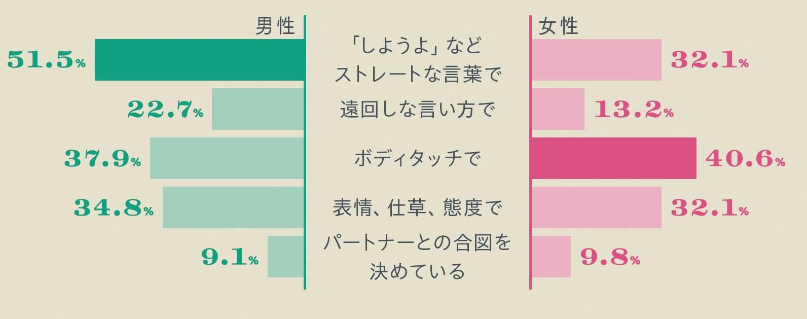 Q、セックスの経験がある女性234人、男性66人に聞きました。自分がセックスしたい時、その気持ちをパートナーにどう伝えますか?(複数回答)