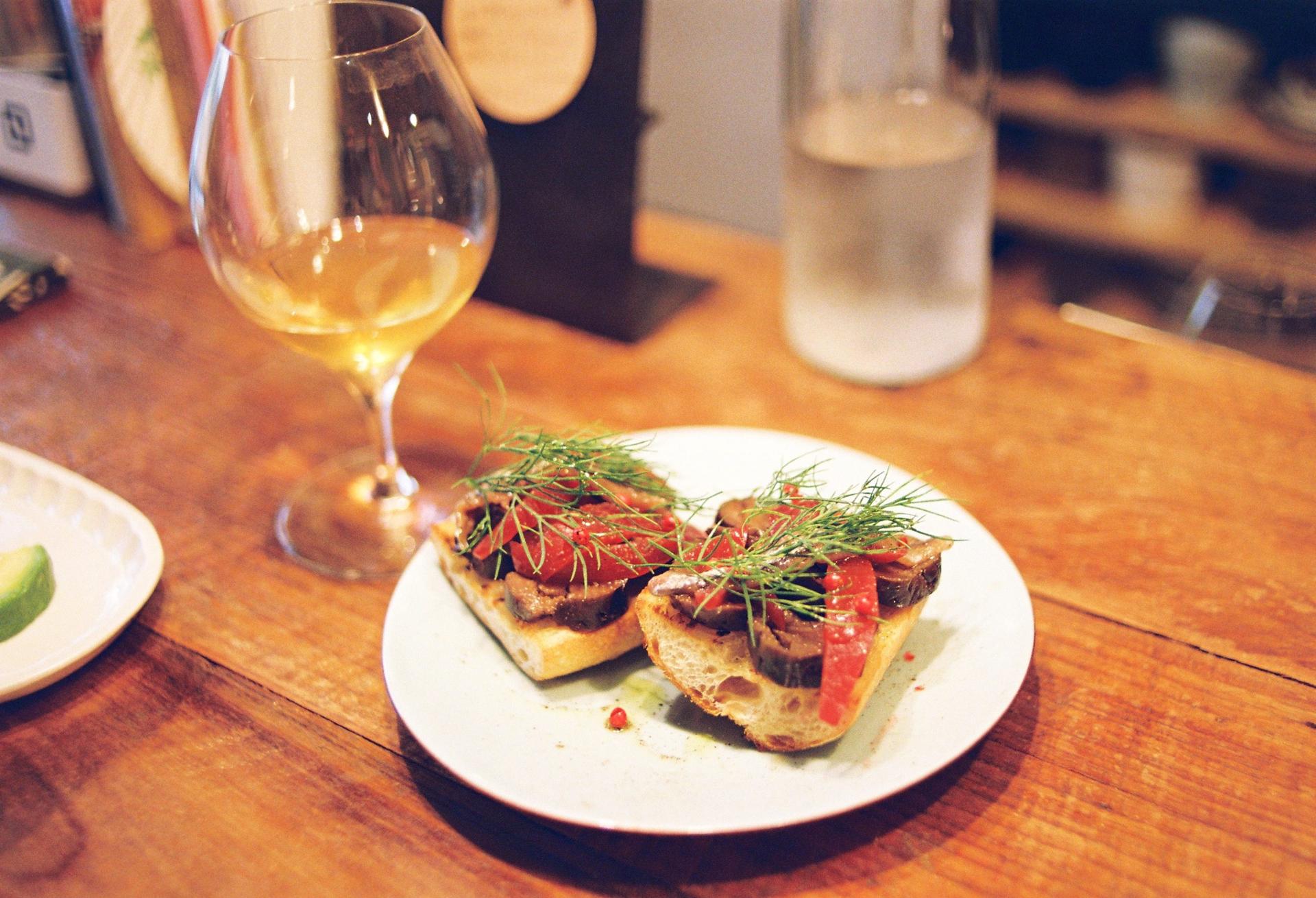 旬の食材を使った創作料理に、視覚も味覚も大喜び。愛媛のアンチョビと茄子のブルスケッタ(2切れ900円)。酸味が効いていて白ワインとマッチ。