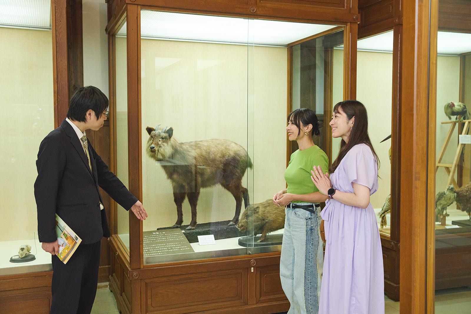 「神宮農業館」で見学できるニホンオオカミの頭骨の前で、長谷川さんの話を熱心に聞く二人。