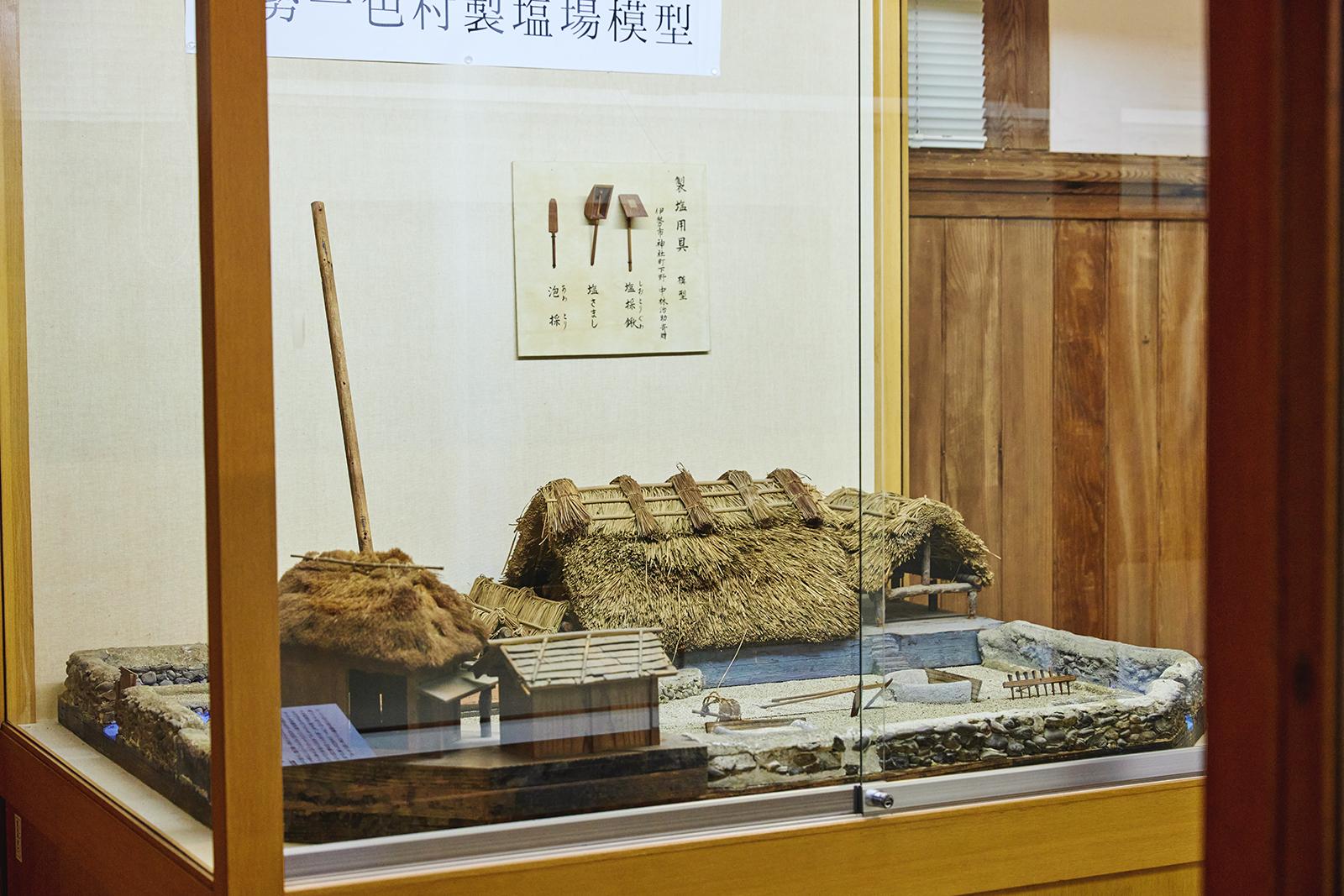 「伊勢一色村製塩場模型」。かつて行われていた塩作りの具体的な工程や、当時の製塩場(塩田)の景観を再現した模型です。