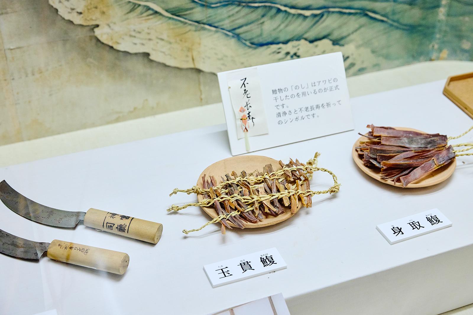 あわびをりんごの皮をむくように薄く切り乾燥させた「のしあわび」。「神宮農業館」では、神様にお供えする御饌(みけ)の一例を展示しています。