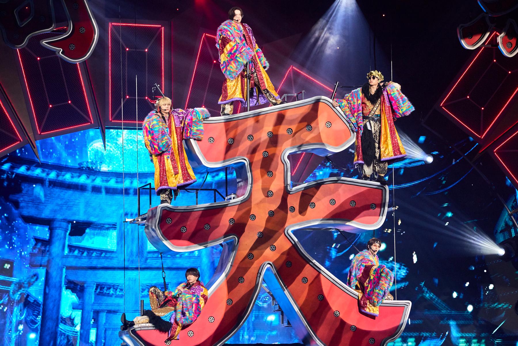 「かかってこいよ、ららアリーナ!!!!!」――。猪狩蒼弥さんの力強いかけ声で幕開けしたKEY TO LITのステージ。オープニングは、彼らの爆発的なポテンシャルの高さと強烈な個性を表現するのにぴったりなオリジナル曲「WAKE UP THE FOOL」。KEY TO LITを漢字で表記すると“奇天烈”…ということで、“奇”という文字が入ったイエローゴールド×ファーのカラフルなド派手衣裳はインパクト満点。炎の特効がバンバン打ち上がり、スモークジェットが噴射する中、巨大な“天”の文字のサイネージに乗った5人がステージに華々しく降臨した。想像もつかない度肝を抜かれる登場シーンは、奇想天外な魅力を放つKEY TO LITならでは。