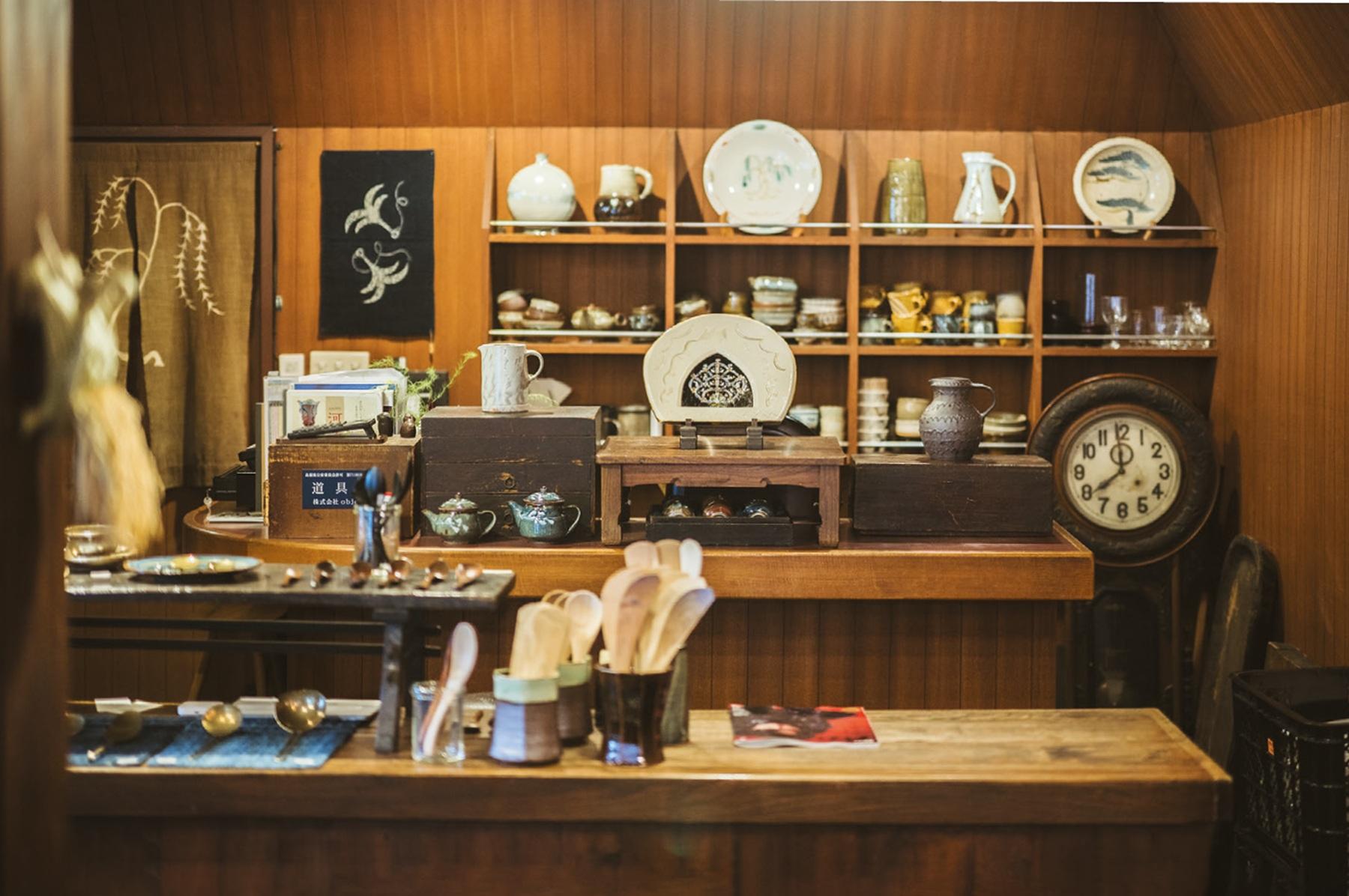 宍道湖から流れ出し、松江を東西に流れる大橋川。そのほとりにあるのが全国から民藝好きが訪れる『objects』だ。西持田窯や森山窯、湯町窯など山陰を中心に日本各地の工房に出向き、作り手と対話しながら吟味した手仕事の品がずらり。陶器や漆器、ガラスや木工、鍛金など幅広いジャンルの作品が並ぶ。元はテーラーだったという建物のレトロモダンな造り、大きな窓の外に揺れる川岸の柳も趣深い。