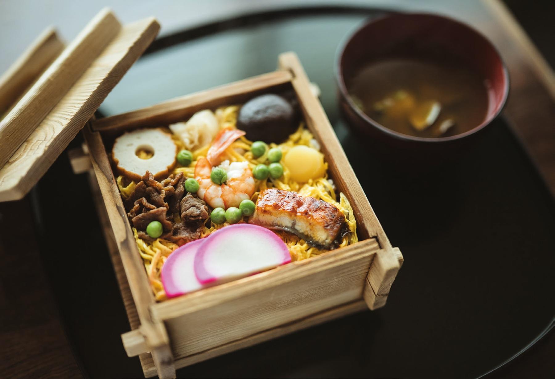 ふたを開けた瞬間、湯気とともに甘い香りがたちのぼる。熱々の酢飯の上に鰻やエビ、牛肉しぐれ煮や出雲名物アゴ野焼き、錦糸玉子などが彩りよく盛り込まれて目にもご馳走だ。松江藩士だった初代が明治になり、大阪で修業の末に創業した店は今や5代目。「冬でも寿司を美味しく」と考えだした蒸し寿司が、今も変わらず受け継がれている。
