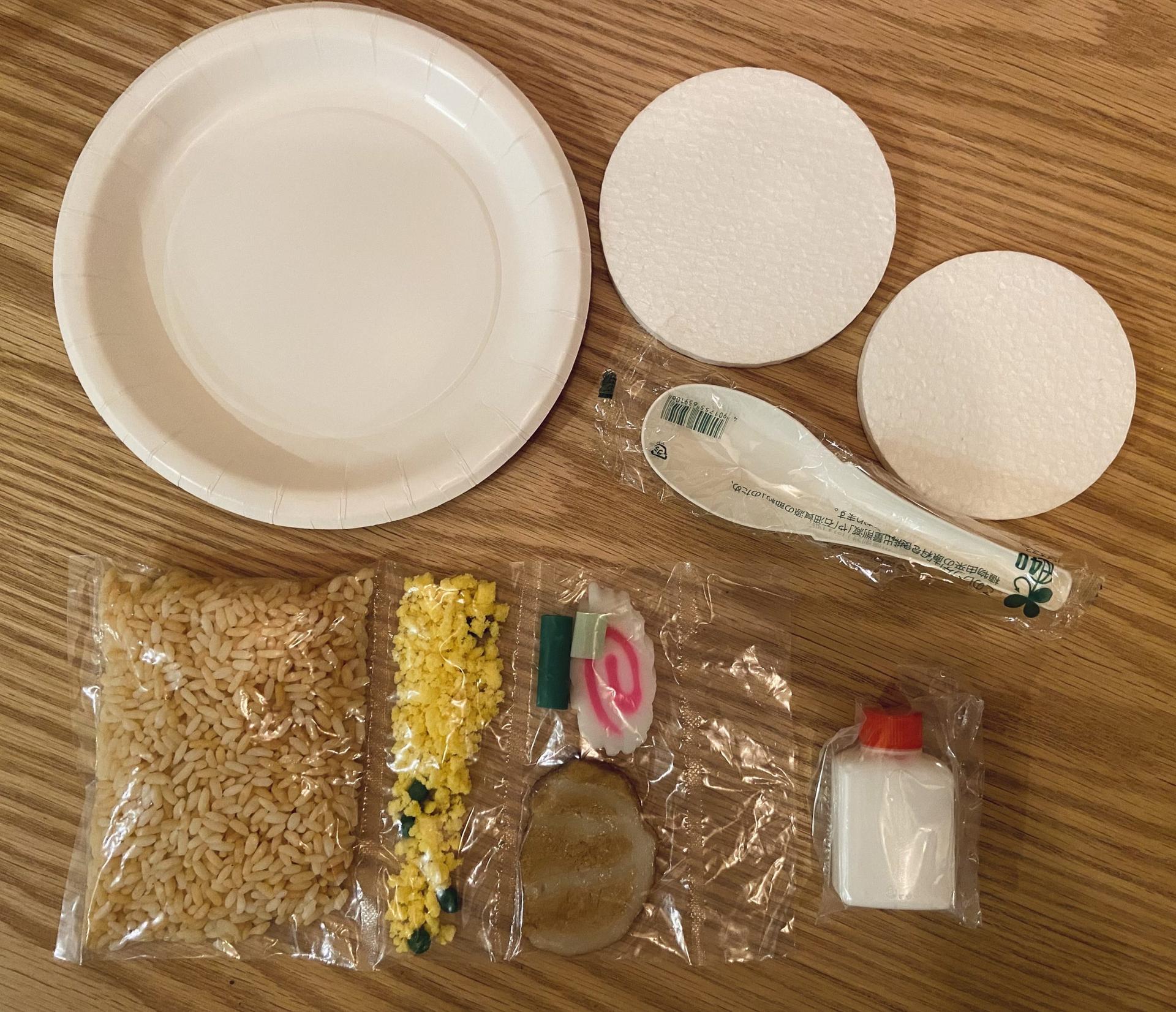 こんな感じでセットになっているのですが、材料を細かくハサミでカットし、ご飯と具材をボンドであえて、お皿に盛り付け。丸1日乾燥させたら完成です。