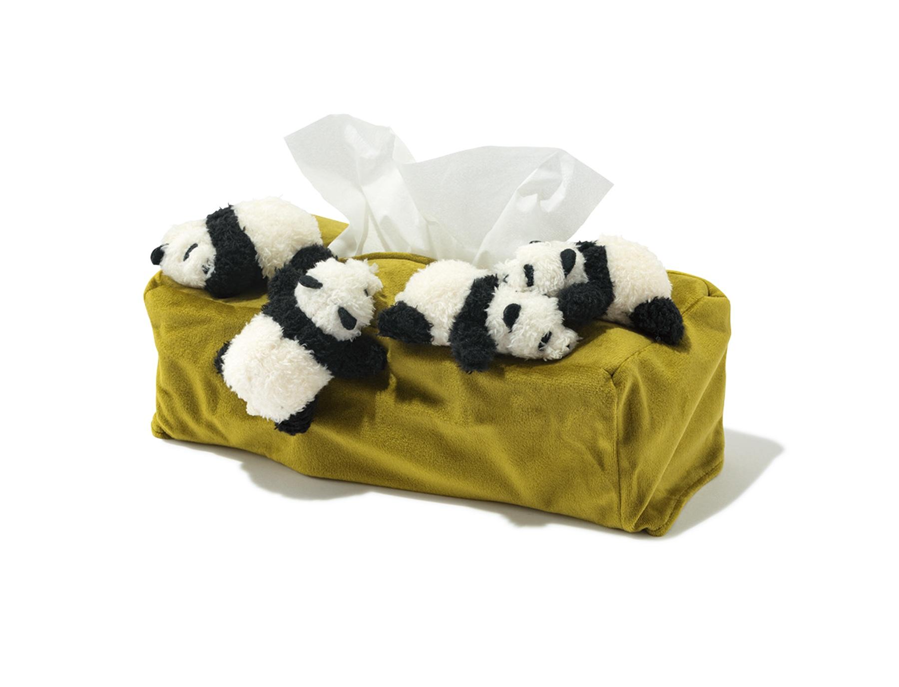 可愛らしい4頭のパンダがお昼寝をしているよう。ふわふわの起毛感がパンダの毛並みを見事に再現している。まるで赤ちゃんパンダのお披露目会みたいなボックスティッシュカバー¥3,520(YOU+MORE!)
