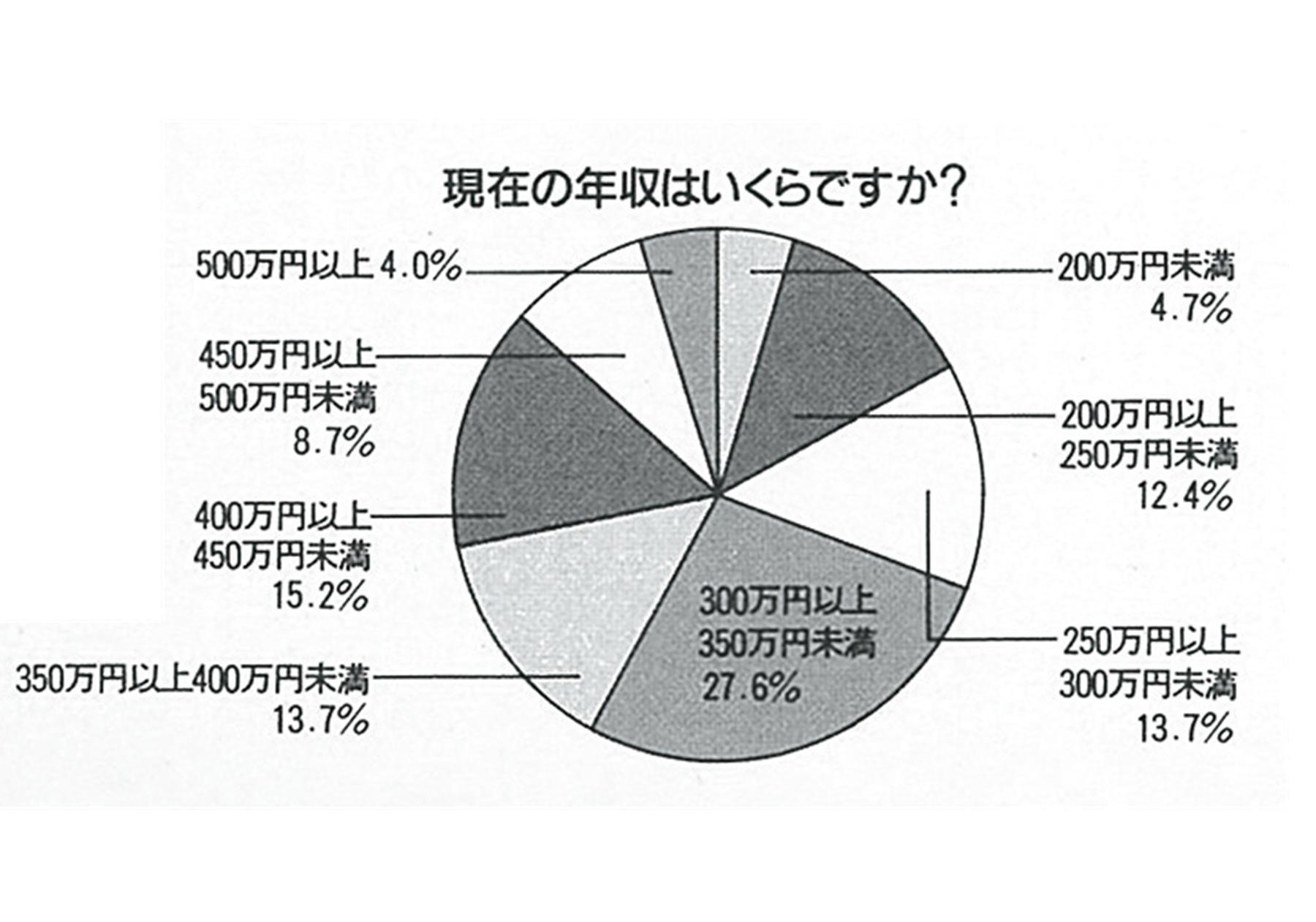 「現在の年収はいくらですか?」という質問に「200万円未満」と答えたのは4.7%。ボリュームゾーンとしては「300万円以上350万円未満」という回答が27.6%ともっとも多く、「500万円以上」と答えたのは4.0%だった(anan844号より)