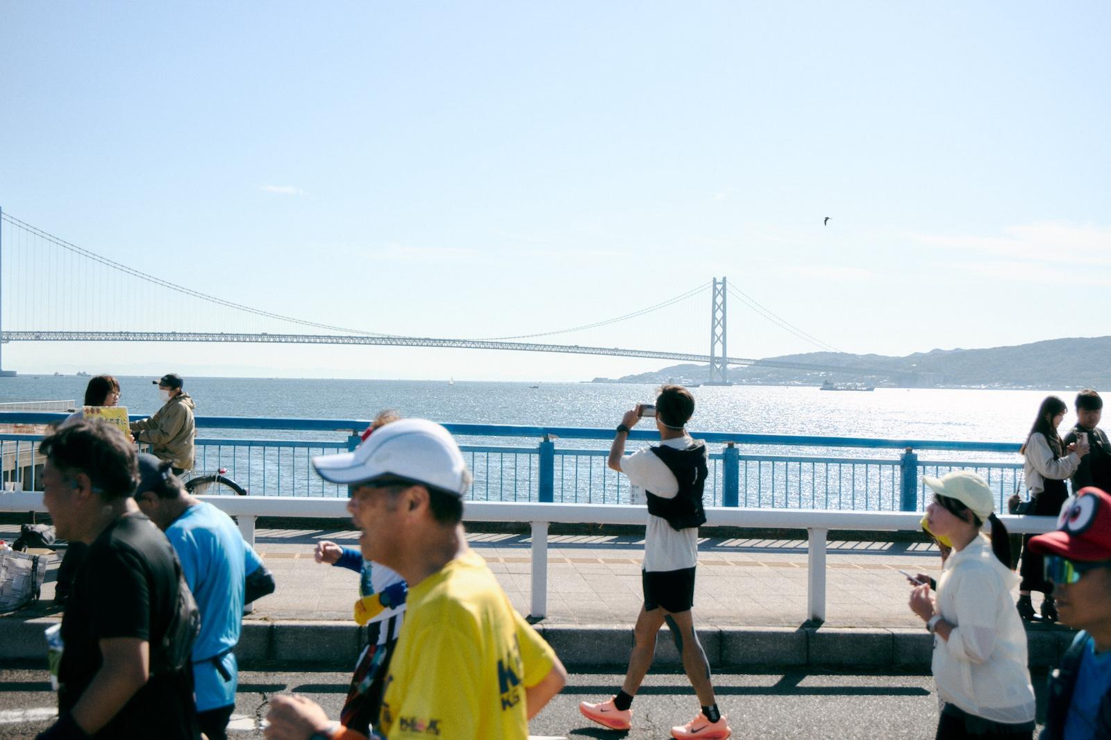 折り返し地点は、明石海峡大橋を望む絶景ポイント。思わず写真を撮るランナーも