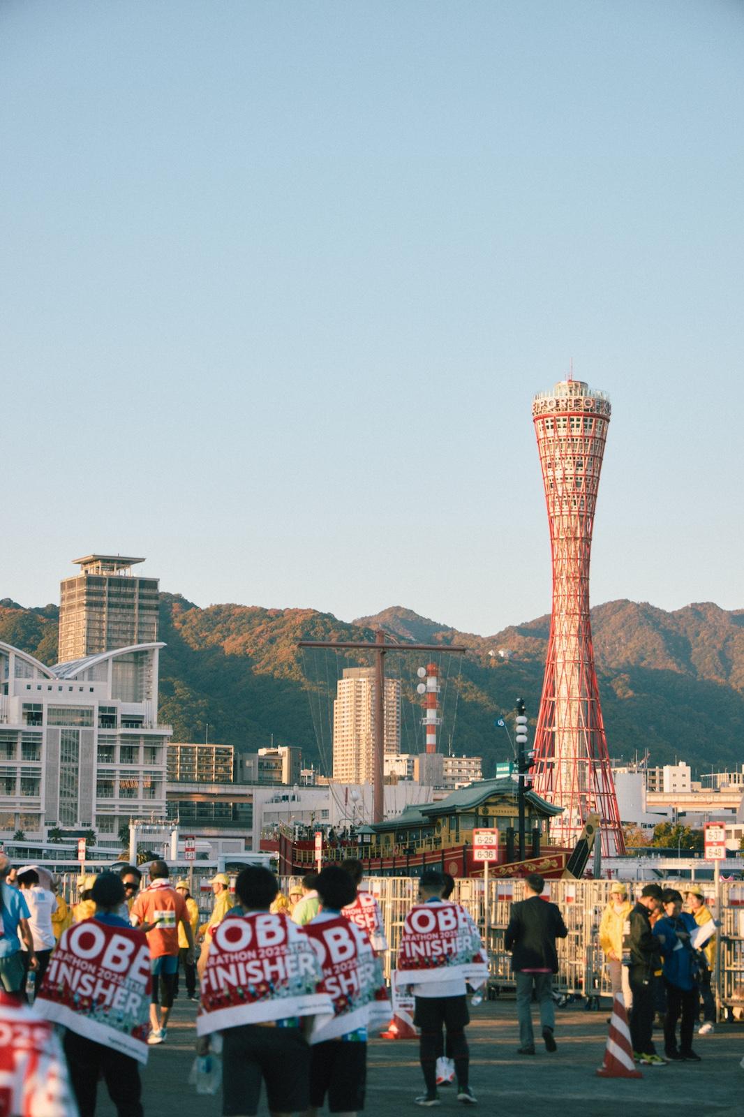 夕暮れの神戸ポートタワーと、フルマラソンを終えたランナーたち