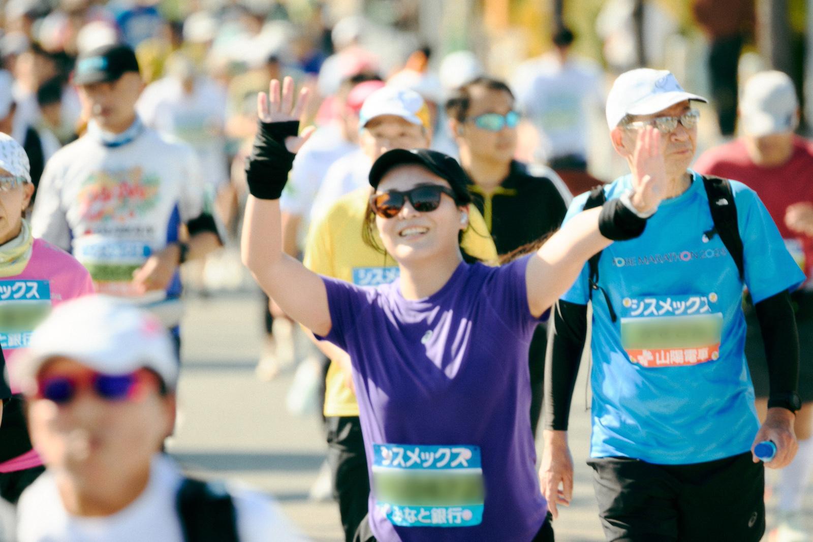 笑顔で手を振る片桐さん。本番でも、おやつがランの原動力に