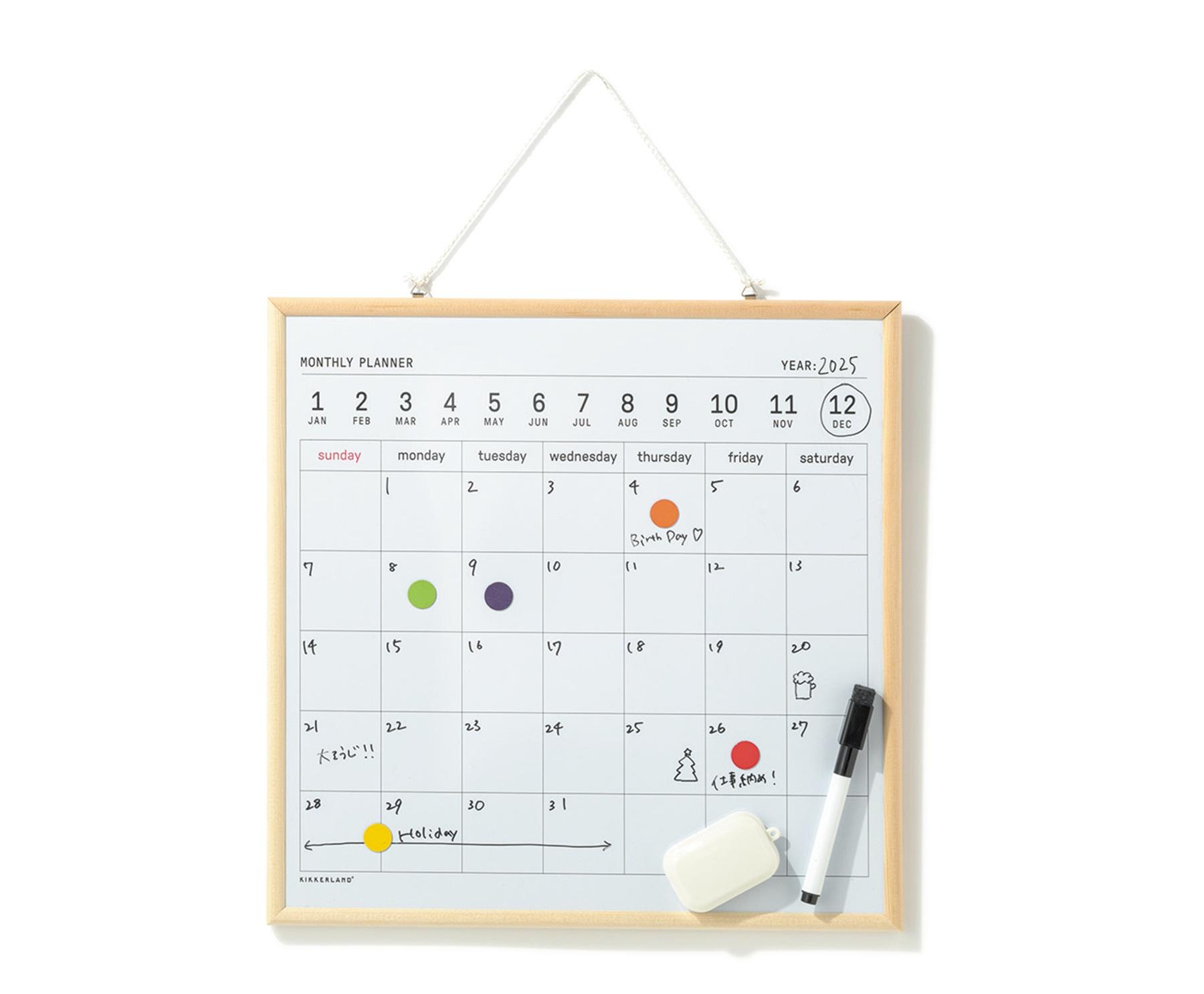 ペンやイレーサーのほか、定期的な予定などを色ごとに振り分けられるカラーマグネットも付属。セットの金具と紐で壁に吊るせるのも便利。W34×D1×H34cm ¥3,520(キッカーランド/DETAIL ONLINE STORE)