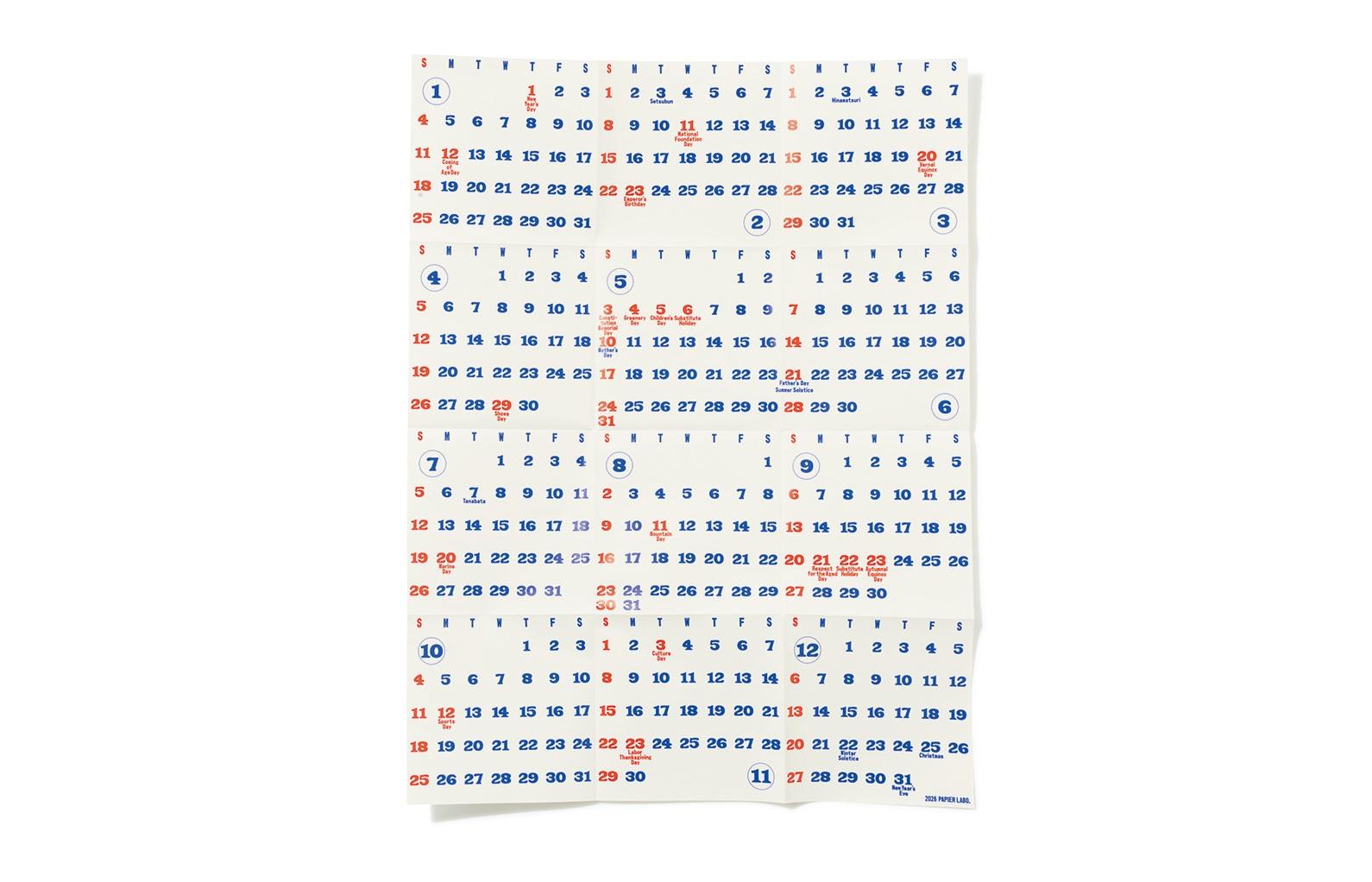 一年の中での“今日”を把握するのにちょうどいい大きさ。毎日見ても飽きがこないよう計算された2色の構成や、七夕など祝日ではないけれど覚えておきたい日が記されているのもポイント。約43×57cm ¥1,430(パピエラボ TEL. 03-5411-1696)
