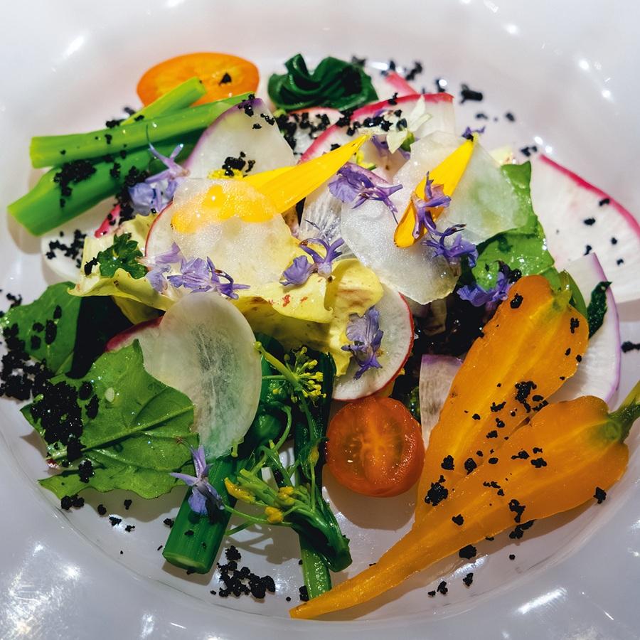 サラダには色とりどりの新鮮な野菜やハーブが使われ、なかには料理人が自ら収穫したものも。