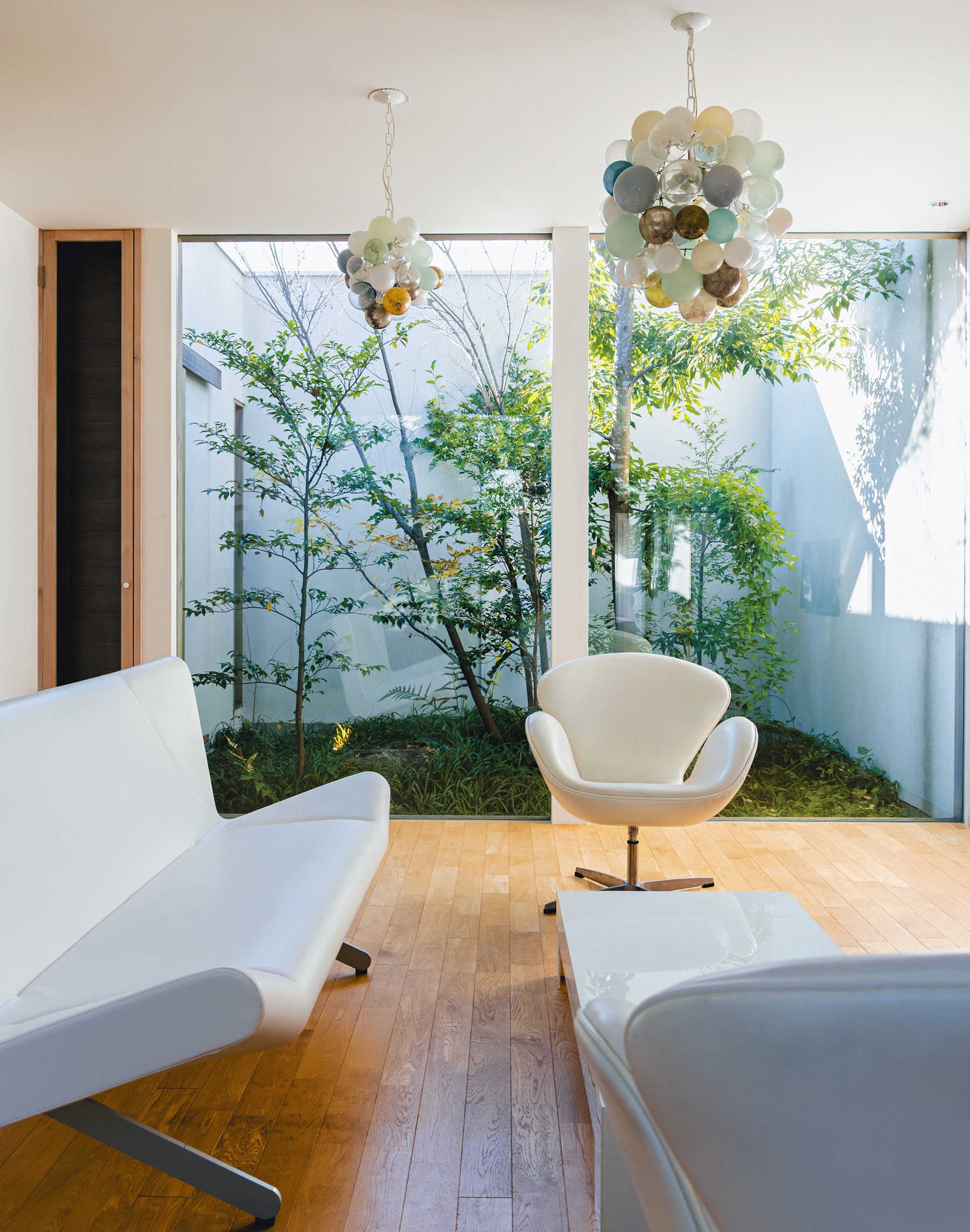 「湯の山 素粋居」のヴィラのひとつ、「硝白(SHOHAKU)」のリビング。印象的なシャンデリアはガラス作家・イイノナホさんの作品。