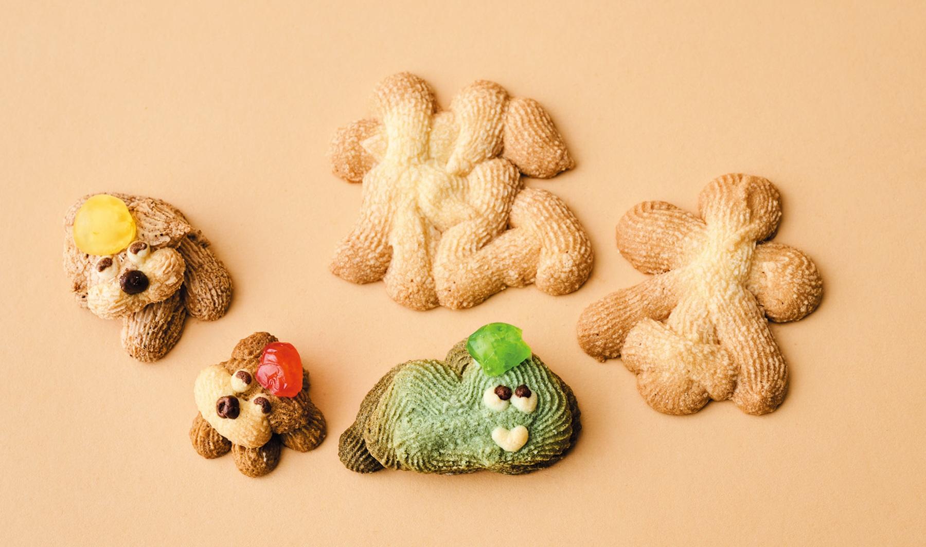 1911年創業の翁堂 本店で、犬のルーパーは、職人の木内靖さんがお子さんと一緒にふざけながら考えて誕生。サクサク美味しいルーパーたちは、それぞれフレーバーも異なるのでお気に入りを見つけて。左から、ピン子ちゃん、犬のルーパー(幼少期)、ヤマガスキー各 ¥220。フォントクッキー1文字 ¥110(予約で文字指定可能)。