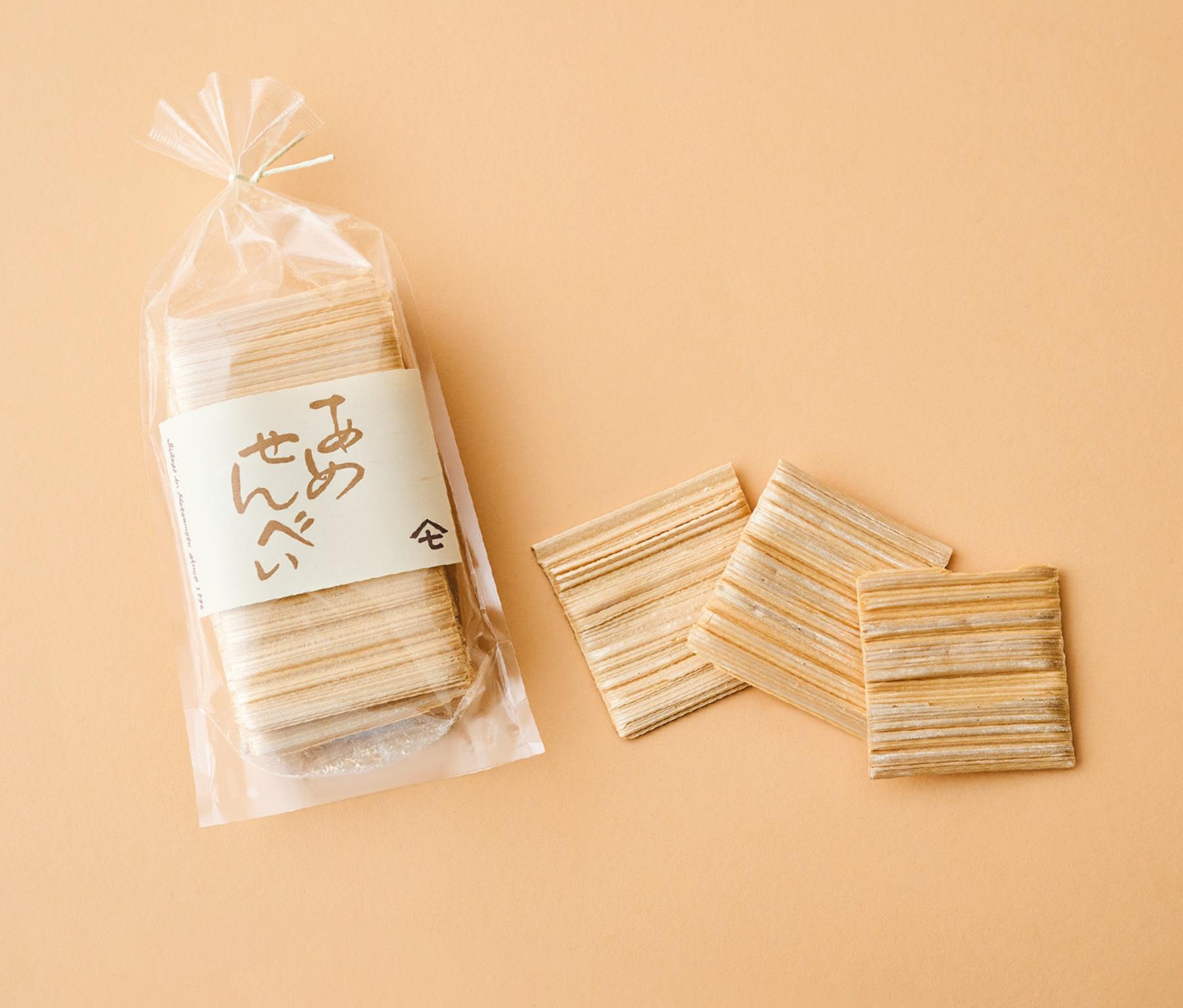 なんと寛政8(1796)年創業、200年以上続く飴店。9代目・伊藤雅之さんによると、松本藩主の水野氏に仕えた先祖が、飴店を開業したのが始まりだそう。あめせんべいは砂糖が普及し始めた頃登場した飴菓子が20数年前に改良され、今の名前に。現在も数種類の砂糖だけを使用し、不思議な食感にやみつきになる人が続出。¥650