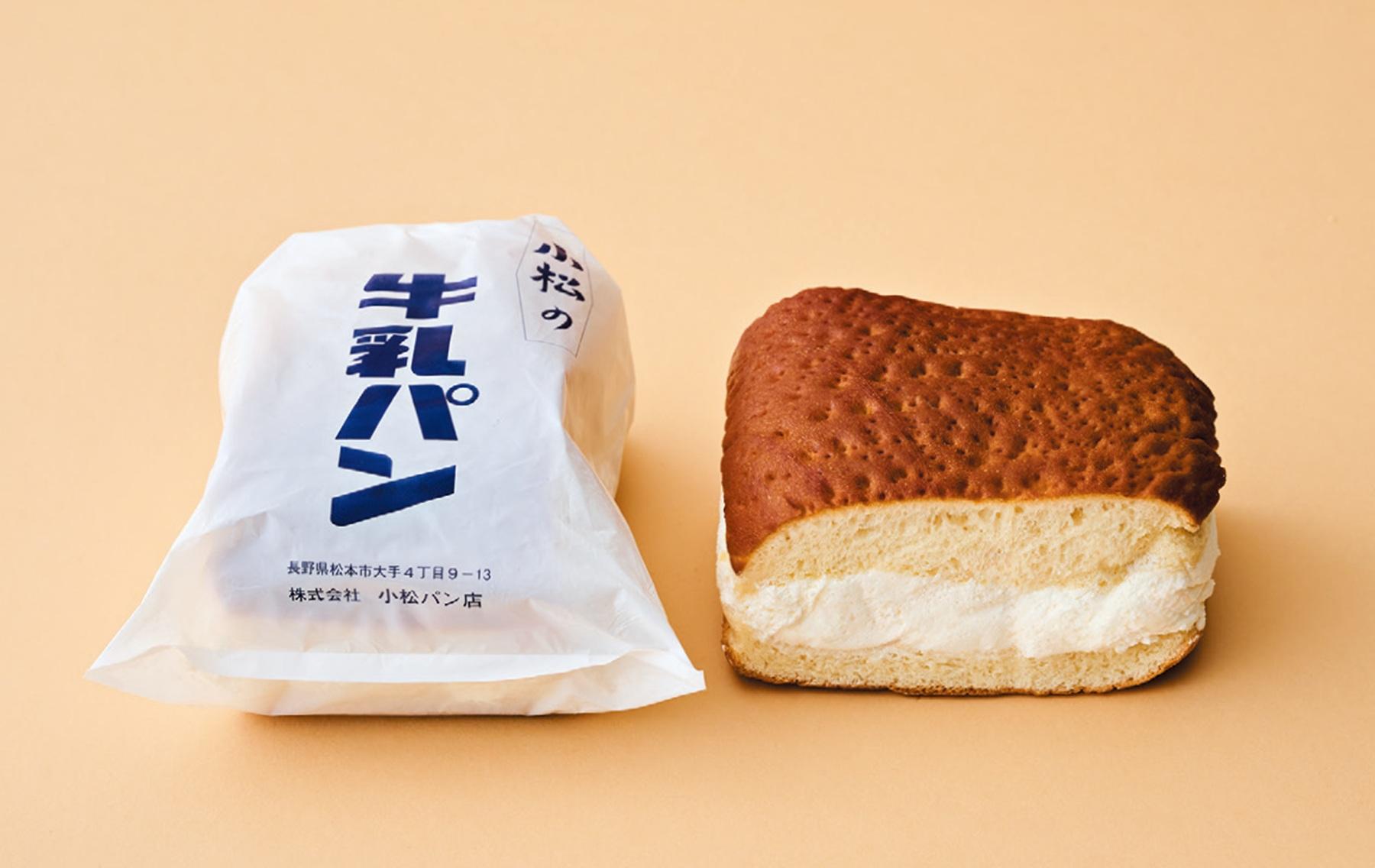 長野名物として有名な牛乳パン。松本で扱うお店の代表格が、大正11年に創業された小松パン店だ。昭和30年代から販売され、レトロなパッケージにぴっちり入っている牛乳パンは、サービス精神からだんだんと大きくなり今の大きさになったと4代目の小松治夫さんは語る。バタークリームとパン生地の牛乳のコクが○。¥497