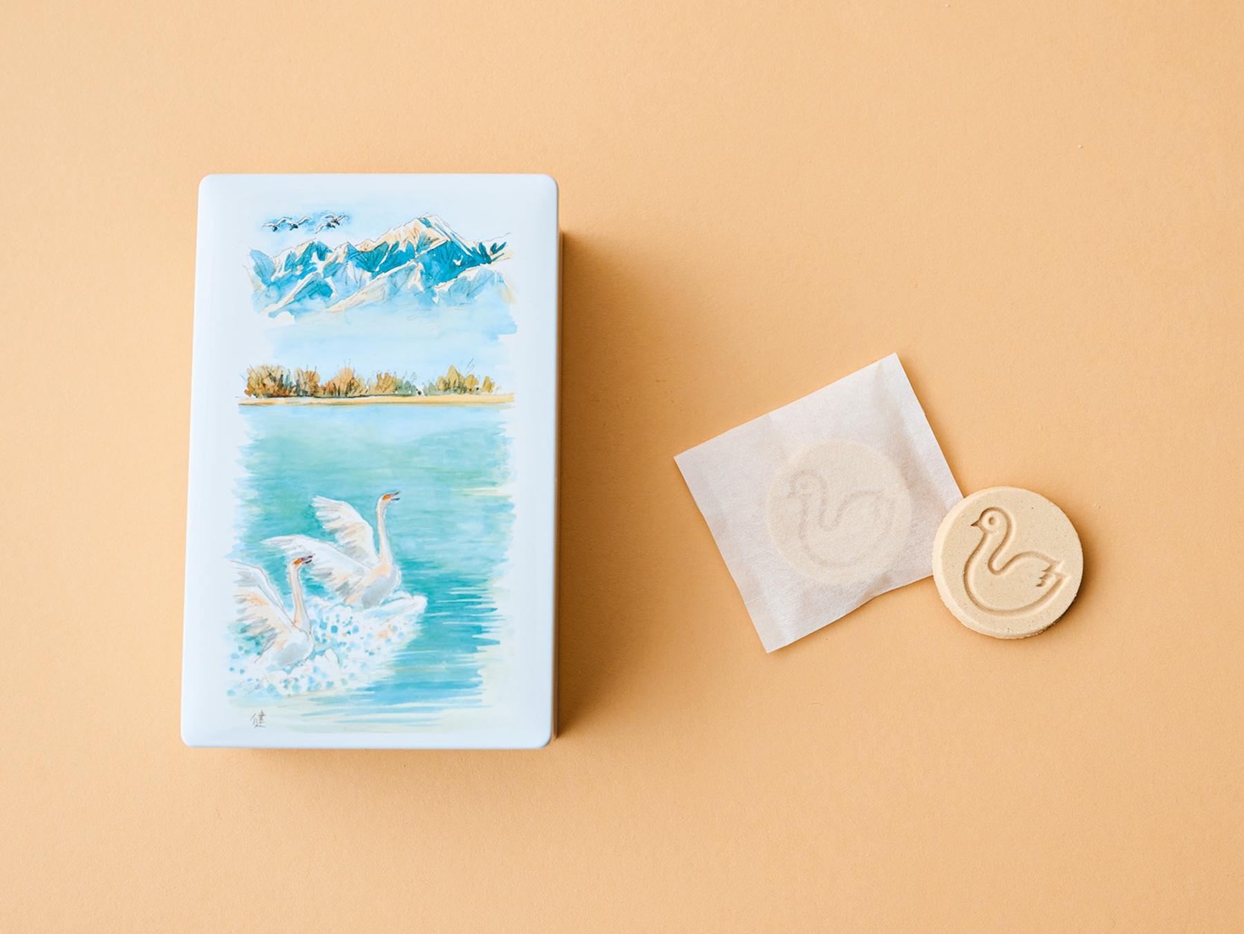 松本を拠点に活躍した洋画家・柳沢健さんの缶の絵に、クッキーに型押された白鳥が印象的な白鳥の湖は、1884年創業の開運堂から。スペイン発祥の「ポルポローネ」というソフトクッキーで、シナモンが豊かに香り、白鳥になぞらえて幸福を運ぶお菓子として高い人気を集めている。16枚入り¥1,912