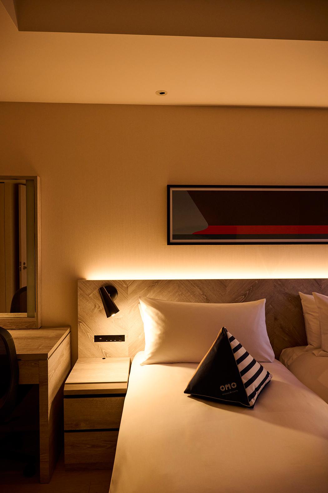 客室は、船のキャビンがモチーフ。テトラポットを思わせる三角のかわいらしいクッションに癒される