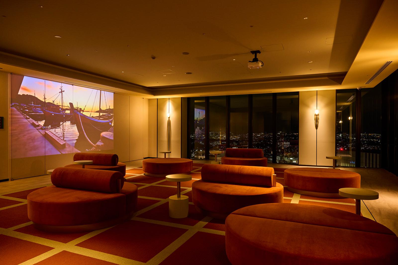 ソファが置かれた「シアター」スペースでは、壁一面に船旅を思わせる映像を投影。夜景とのコラボレーションが堪能できる。また、みなとみらい側に面した「NIGHT VIEW DECK」は、窓の外の夜景をミラーウォールが映す空間で、そこにいるとまるで夜景に包まれるような体験ができるというスペース。一段と写真映えしそうなスポットです。