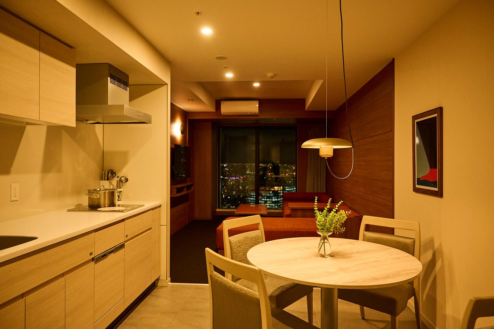 館内にコインランドリーを設置しているホテルは一般的にあるけれど、全室に洗濯乾燥機が付いているのはかなりレア。しかもキッチンもあるから、近所の飲食店で外食をするのはもちろん、食材を買って部屋で料理を楽しむなど、連泊や長期滞在にも活用できます。