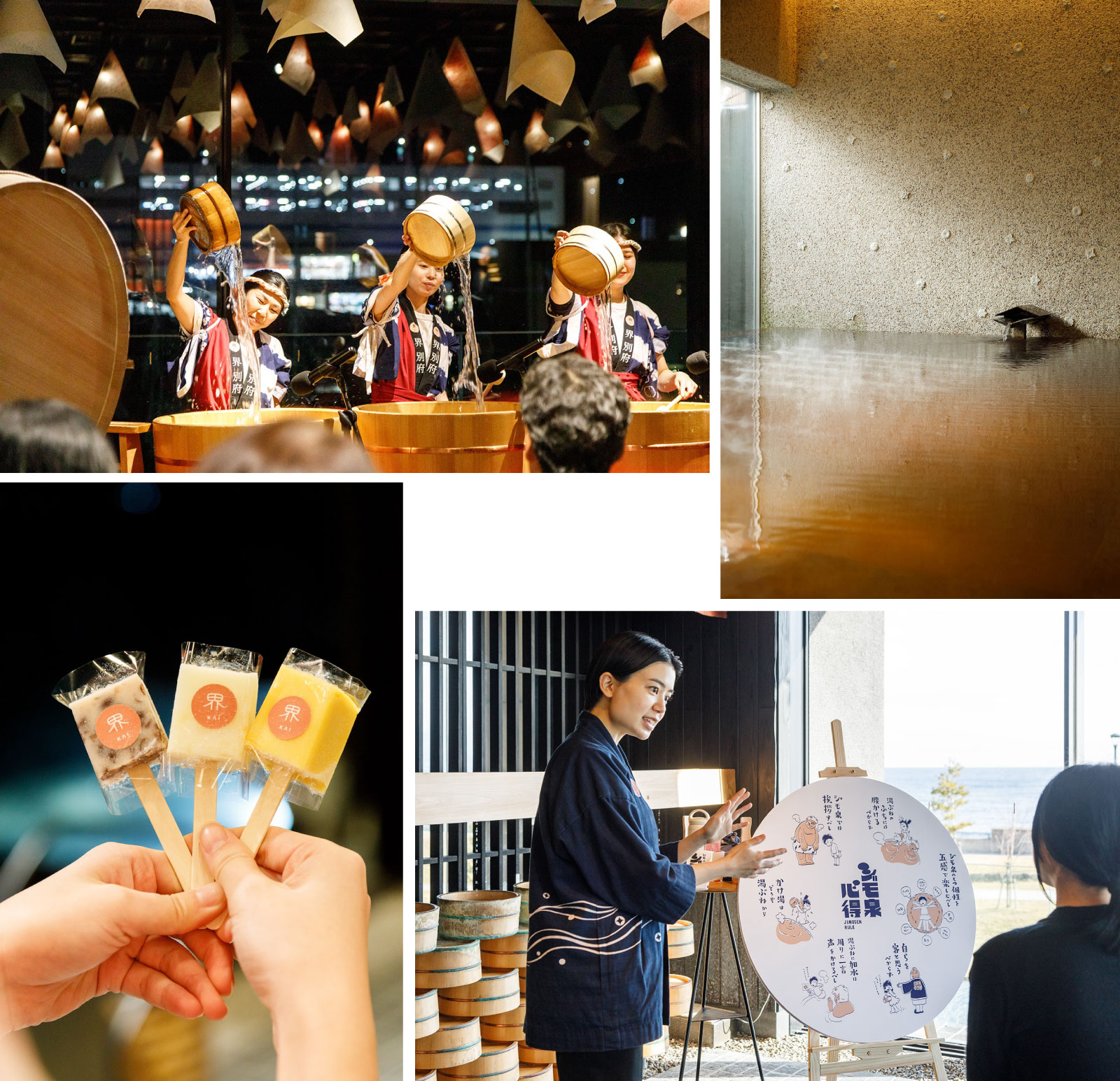 入り口からエレベーターで上がり、開いてすぐに迎え入れてくれるのは「湯の広場」。別府湾からの優しい海風がそよぐ開放感あふれる空間で、一面の桶装飾や石畳、温かな電灯など、一気に別府の街並みや温泉街の世界観に誘ってくれる。チェックイン後は手湯、足湯を楽しむこともできる、居心地の良いパブリック空間だ。