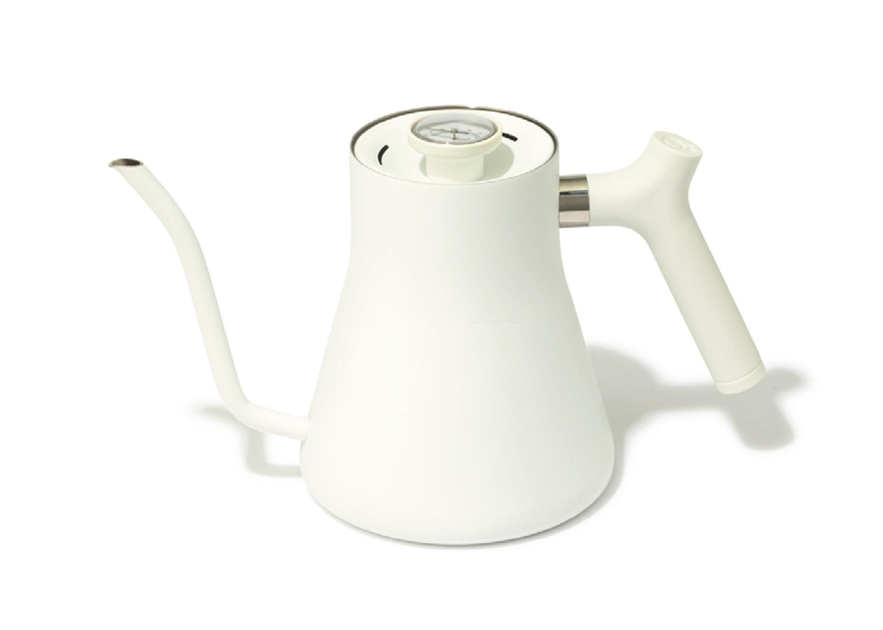 コーヒーの味わいを左右する、大切なポイントのひとつが“湯温”。蓋に温度計を内蔵したケトルなら、抽出に適した温度を正確に測ることができる。直火式 Stagg Pour-Over Kettle 1.2L ¥13,750(Fellow/Kurasu)