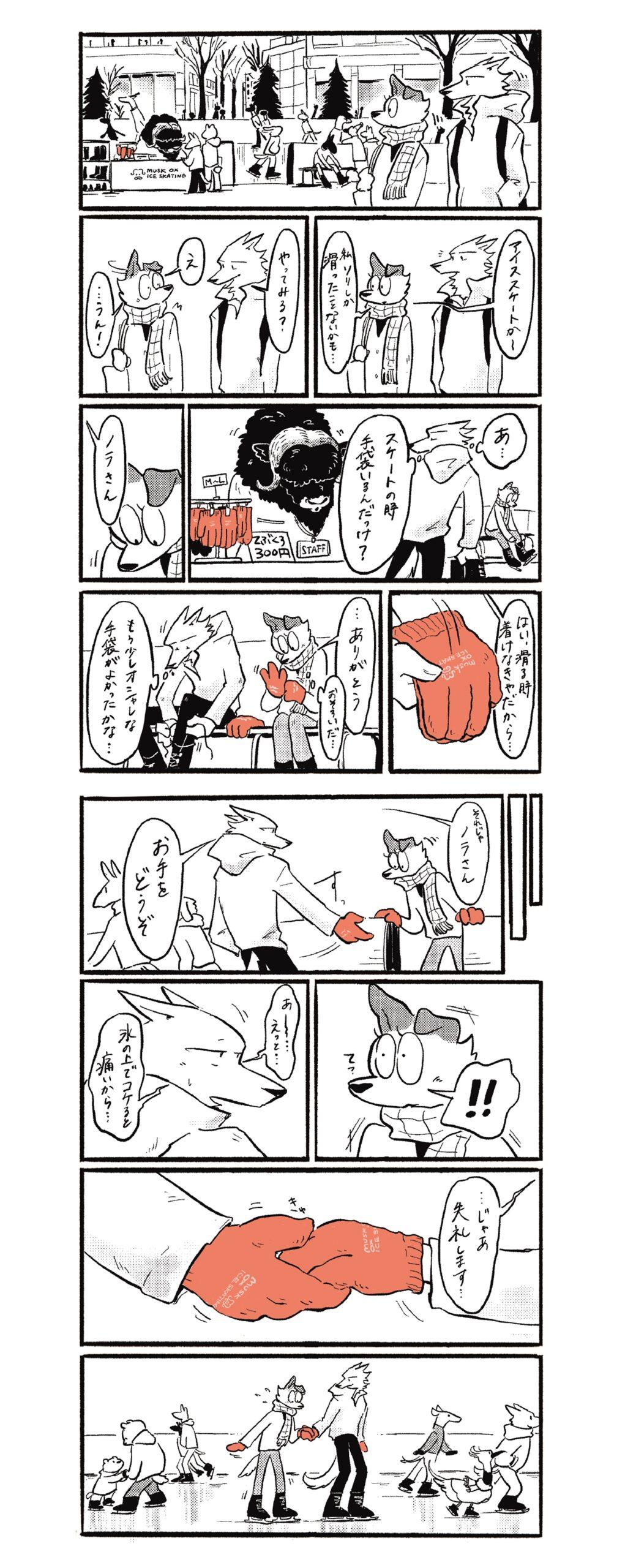 「“惹かれる気持ち”と“冬”をキーワードに『手も心もひかれていく』ノラとアルのスケートのお話です。アルはノラの手をひきながら上手に滑ってくれそうだなと妄想しながら描くのがとても楽しかったです」