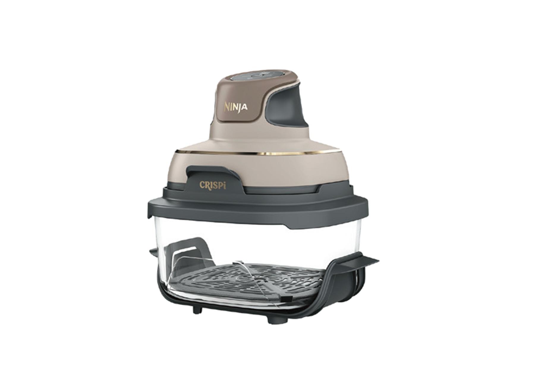 食材を入れて調理し、サーブまで。強力熱風ファン、高火力ヒーター、高熱伝導プレートの組み合わせにより、揚げ物もヘルシーに、本格的な仕上がりを実現。「クリスプ、ベイク・ロースト、リクリスプの調理モードを使えば、火加減の調整いらずのお任せ調理が可能。2サイズのガラスコンテナ付属で、量ごとに使い分けられ、蓋をしてそのまま保存も」(サリーさん)。 ¥29,700(シャークニンジャ TEL. 0120-522-552)