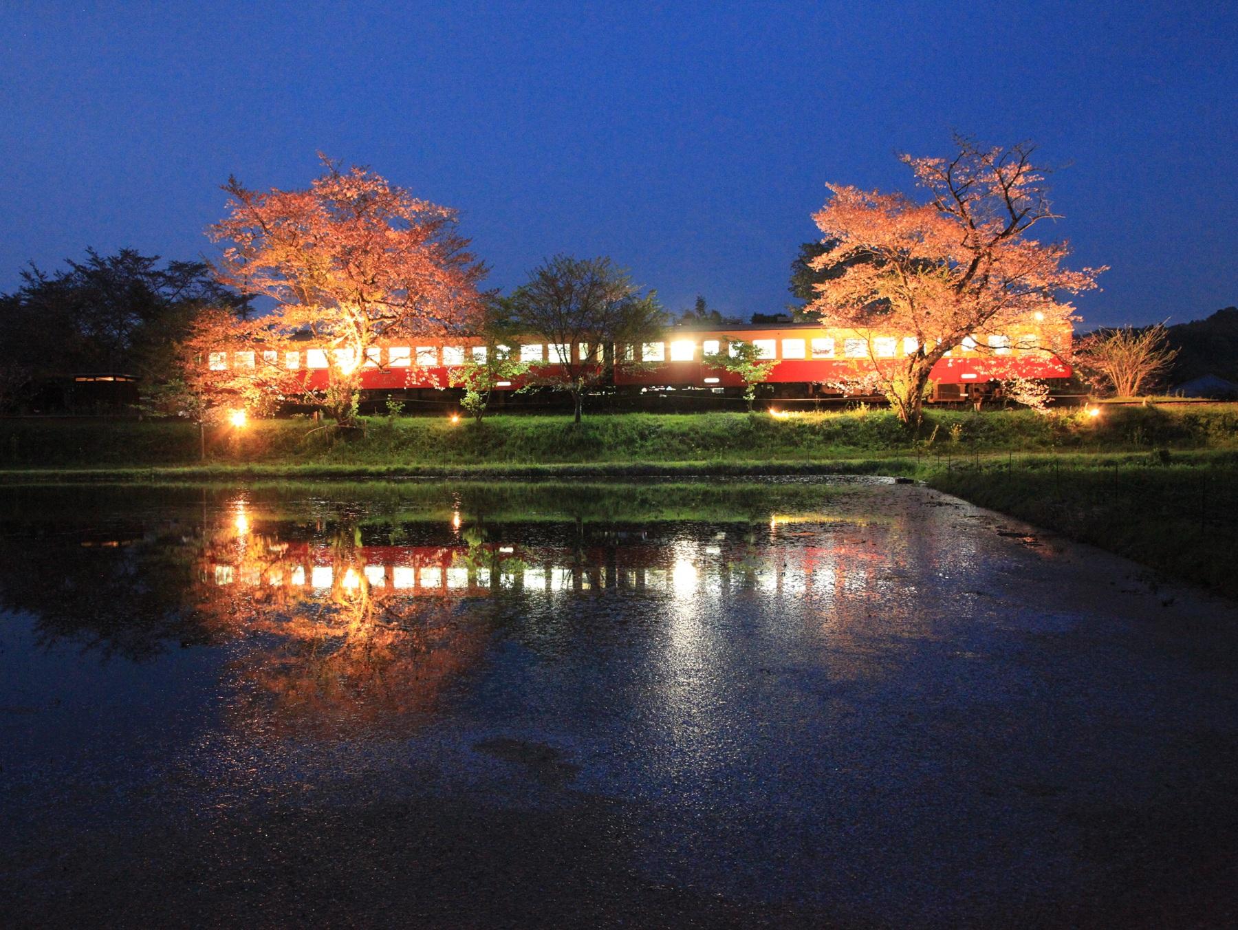「駅裏の田んぼに水が張られ水面に桜が映る“映り桜”が見どころ。日暮れ時のブルーモーメントには桜と空とのコントラストが美しいです。これが終列車なので外から見るなら帰りの足を確保して」