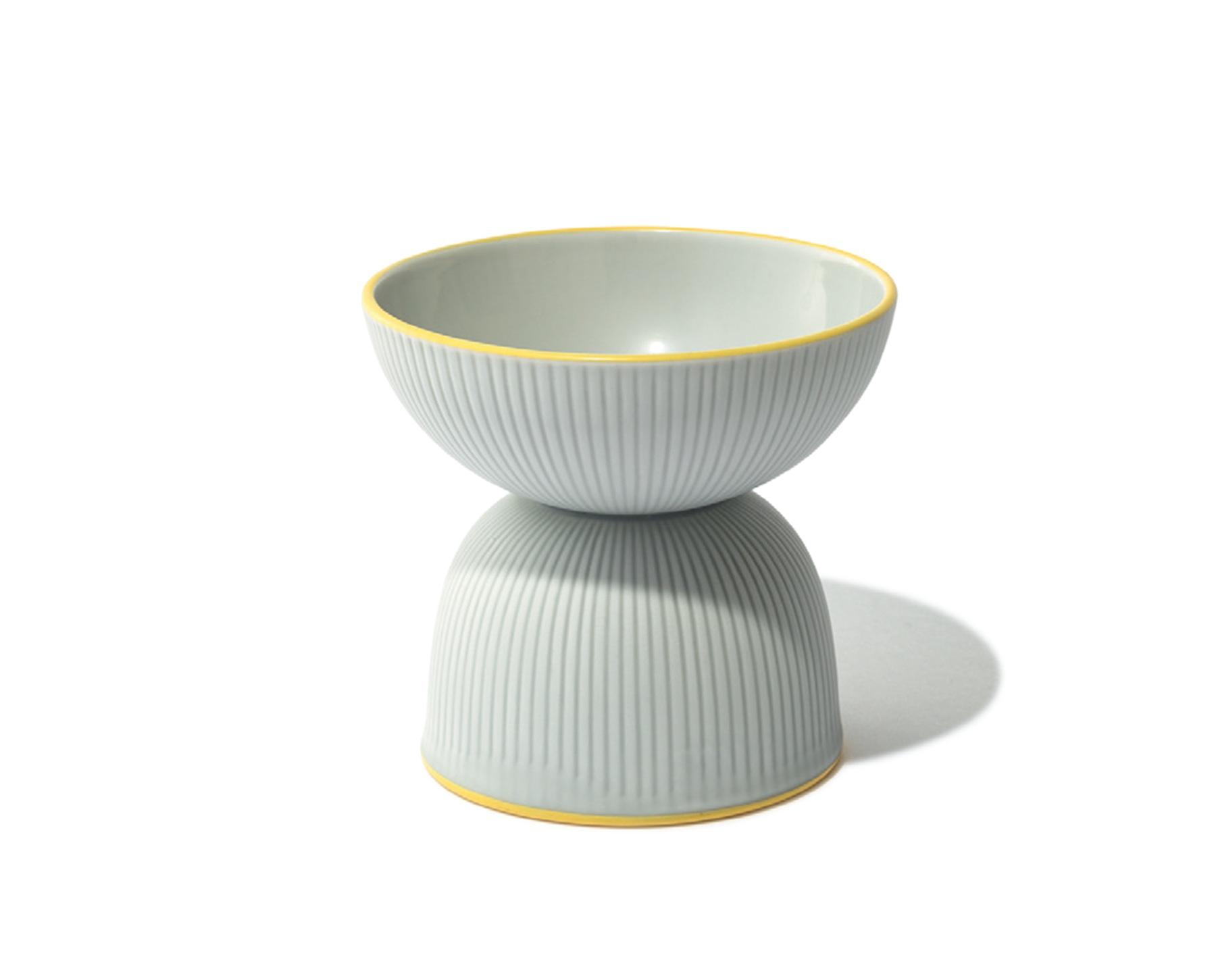 優しい色合いのフードボウルは、食事量や餌の種類に合わせて上下のお碗を使い分けられる。吐き戻しを軽減するとされる食べやすい高さや倒れにくい形など、猫に優しいデザイン。φ14.5×H13cm ¥6,380(tetetote/maar support@tetetote.com)