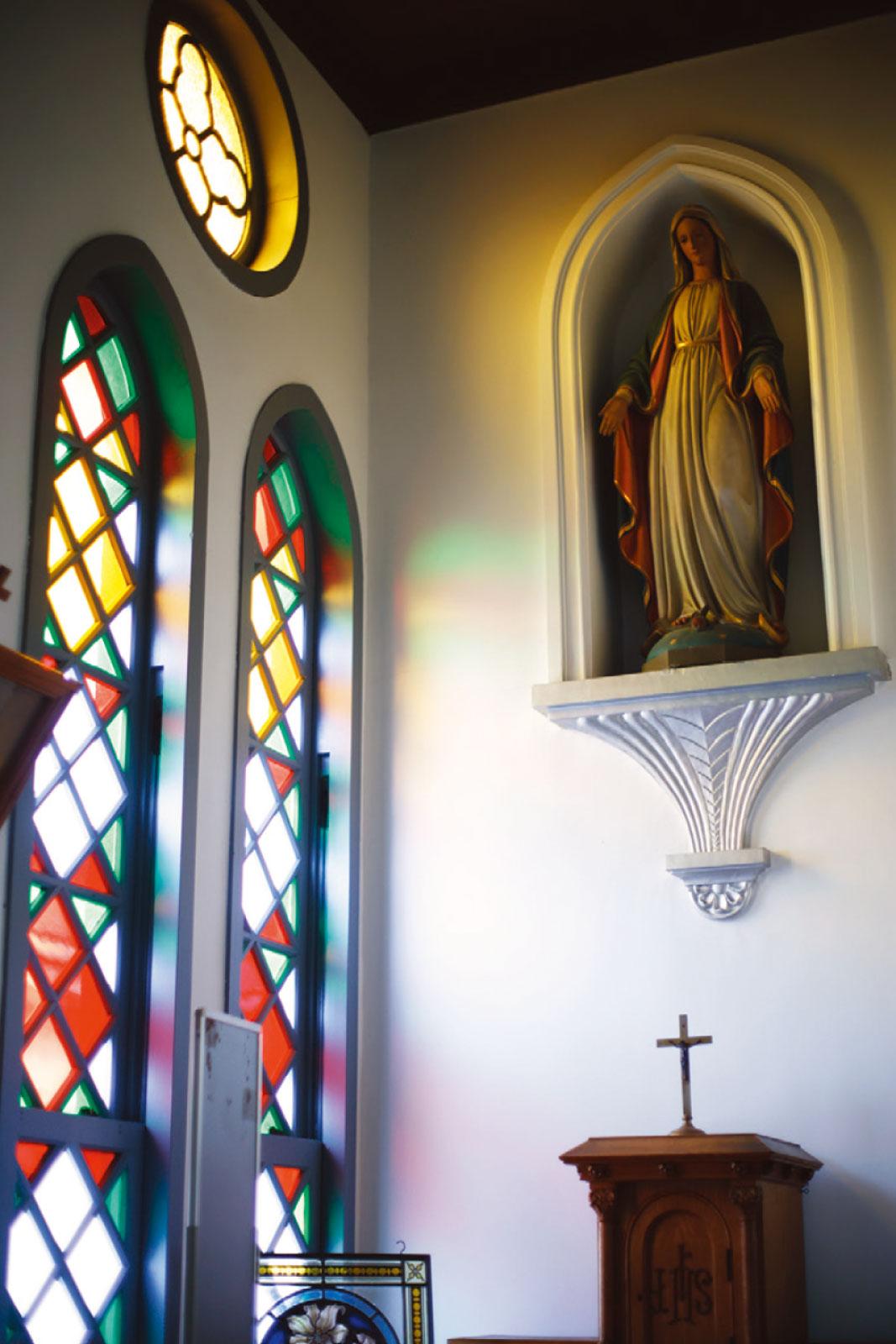 色鮮やかなステンドグラス越しに注ぐ光が畳を照らし出す様子はとても美しく、自然と敬虔な気持ちになる。教会や、信者たちの歴史に興味がある人は、近くにあるキリシタンの殉教地に建立された「乙女峠マリア聖堂」もぜひ訪れてみて。毎年5月に「乙女峠まつり」が開催される。