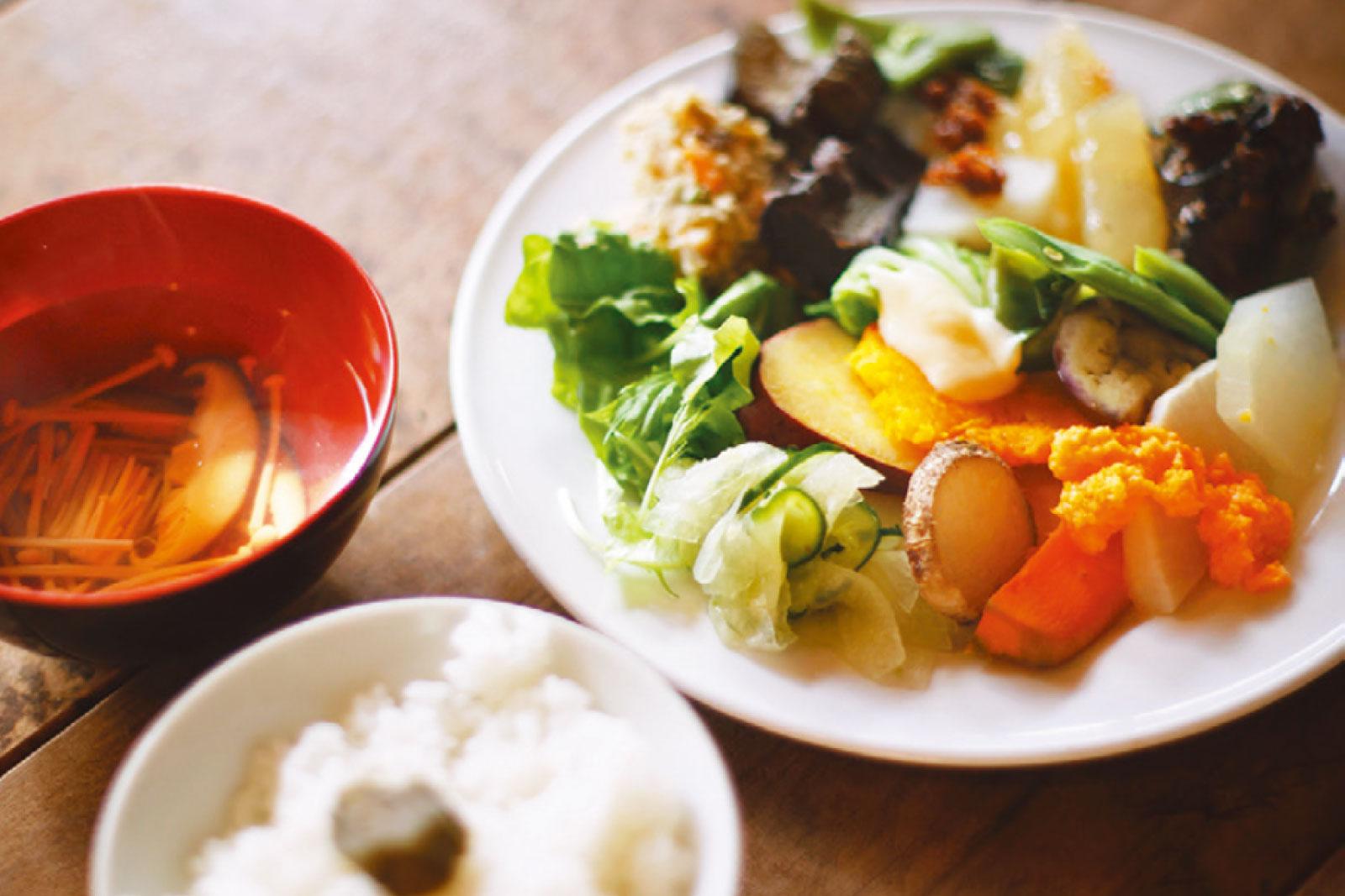 中心地から少し離れた里山の中にある、医食同源の考えに基づいた料理が楽しめるレストラン。曜日によってメニューは異なるが、1番人気は地元で育てられた旬野菜料理のビュッフェ。どの野菜も旨味がしっかりあり、ひとくち食べるごとに体が喜ぶ、そんな感覚に満たされます。
