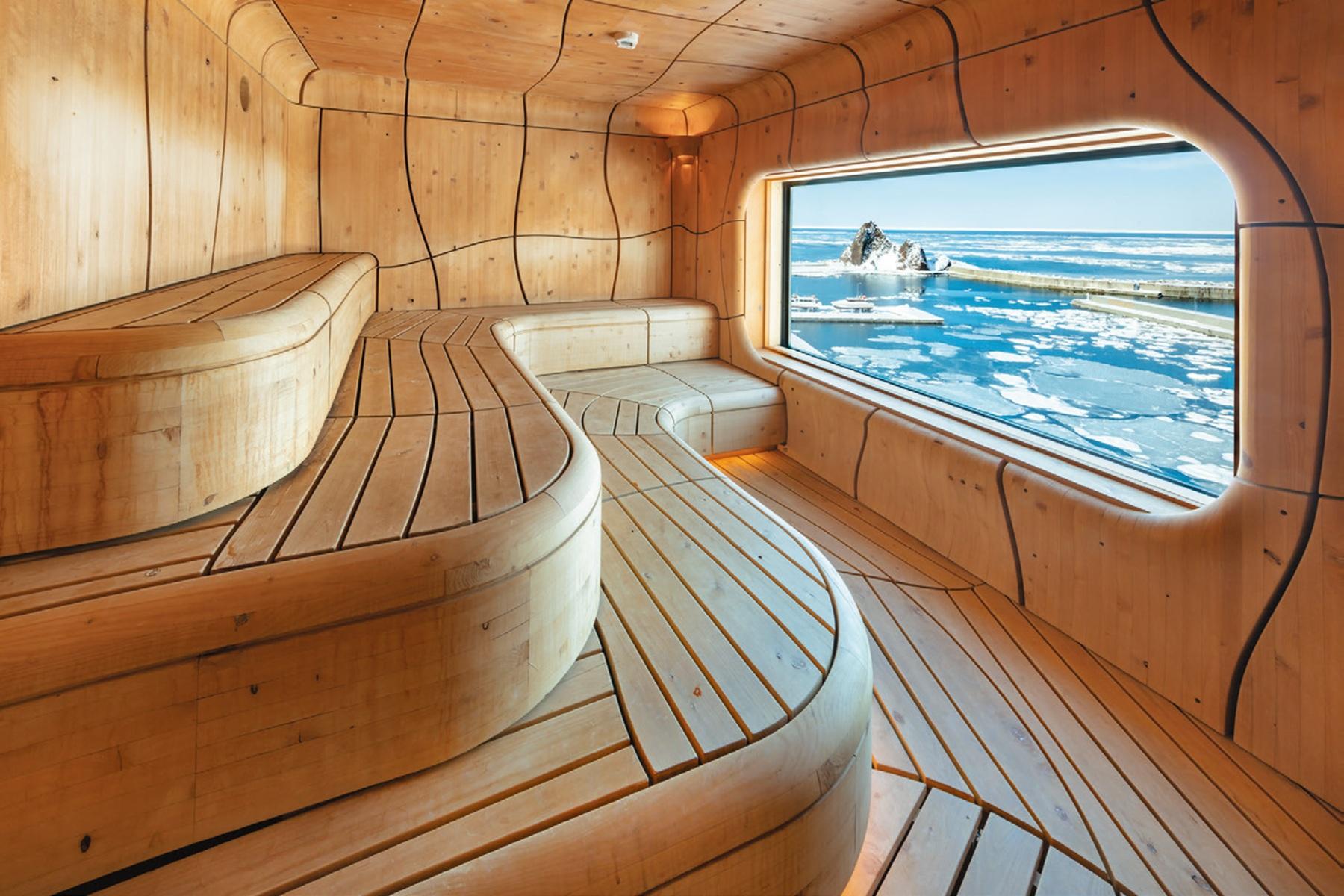 目の前にオホーツク海が広がる展望大浴場は、冬には流氷を眺めながらサウナと温泉に浸かれるとっておきの特等席。「KAKUUNA(カクウナ)」「UNEUNA(ウネウナ)」の2種のサウナを含む大浴場は、15:00~24:00/5:00~10:00と時間で男女入れ替え制。そのため夕暮れなど時間を狙って入るファンも。プライベートサウナを完備した客室「サウナ付スパスイート」もあり。
