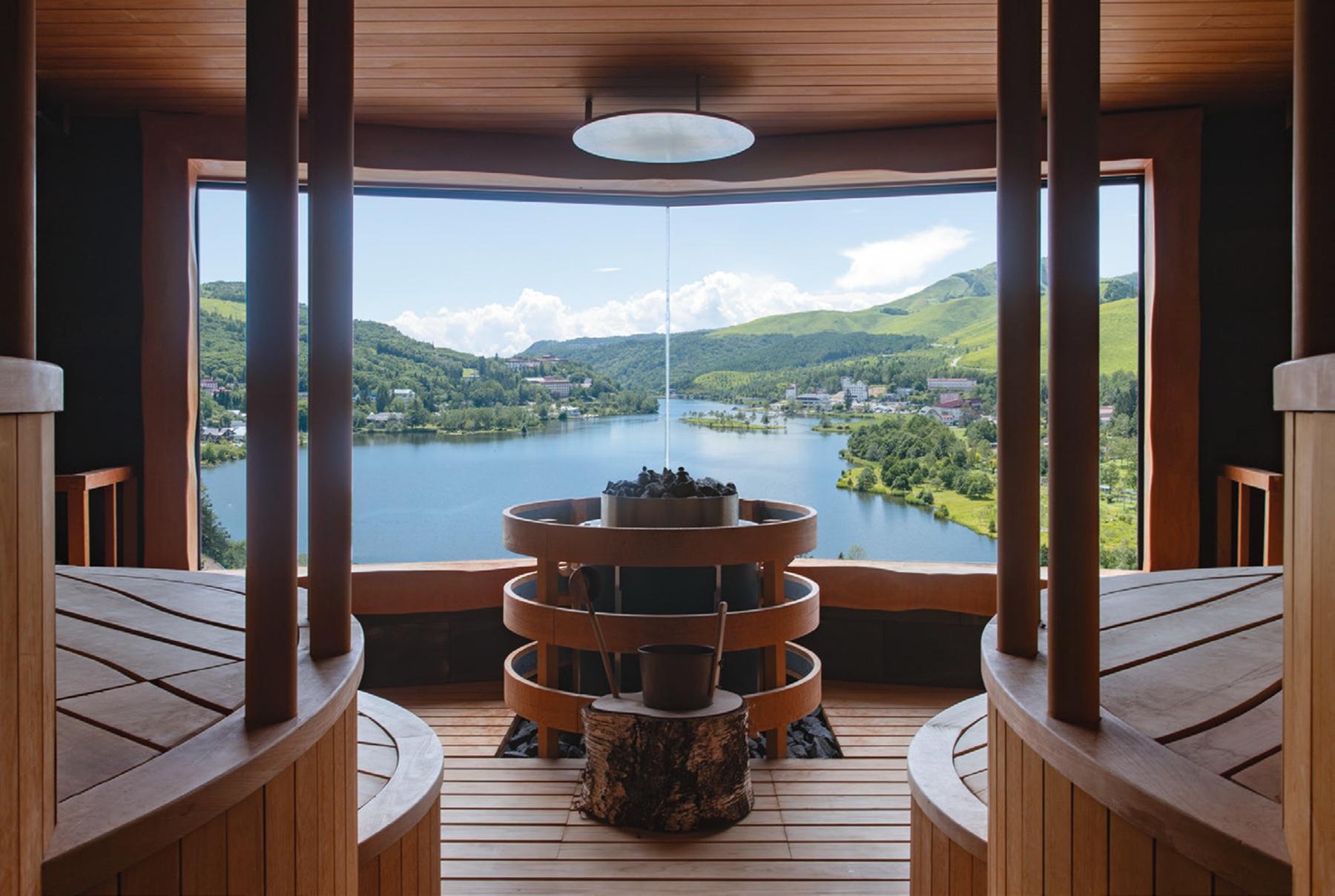 2023年オープン、「池の平ホテル」新本館の「展望サウナ ‐Ku‐」は、車山の山並みと白樺湖を一度に望むパノラマビュー! 抜けの良い景観は、暖かい季節の緑も、寒い季節の雪景色もずっと眺めていたくなる美しさ。さらには蓼科山の伏流水掛け流しと、水風呂まで極上だ。景色を部屋でも堪能したい人には「デラックスレイクビュー和洋室」がおすすめ。