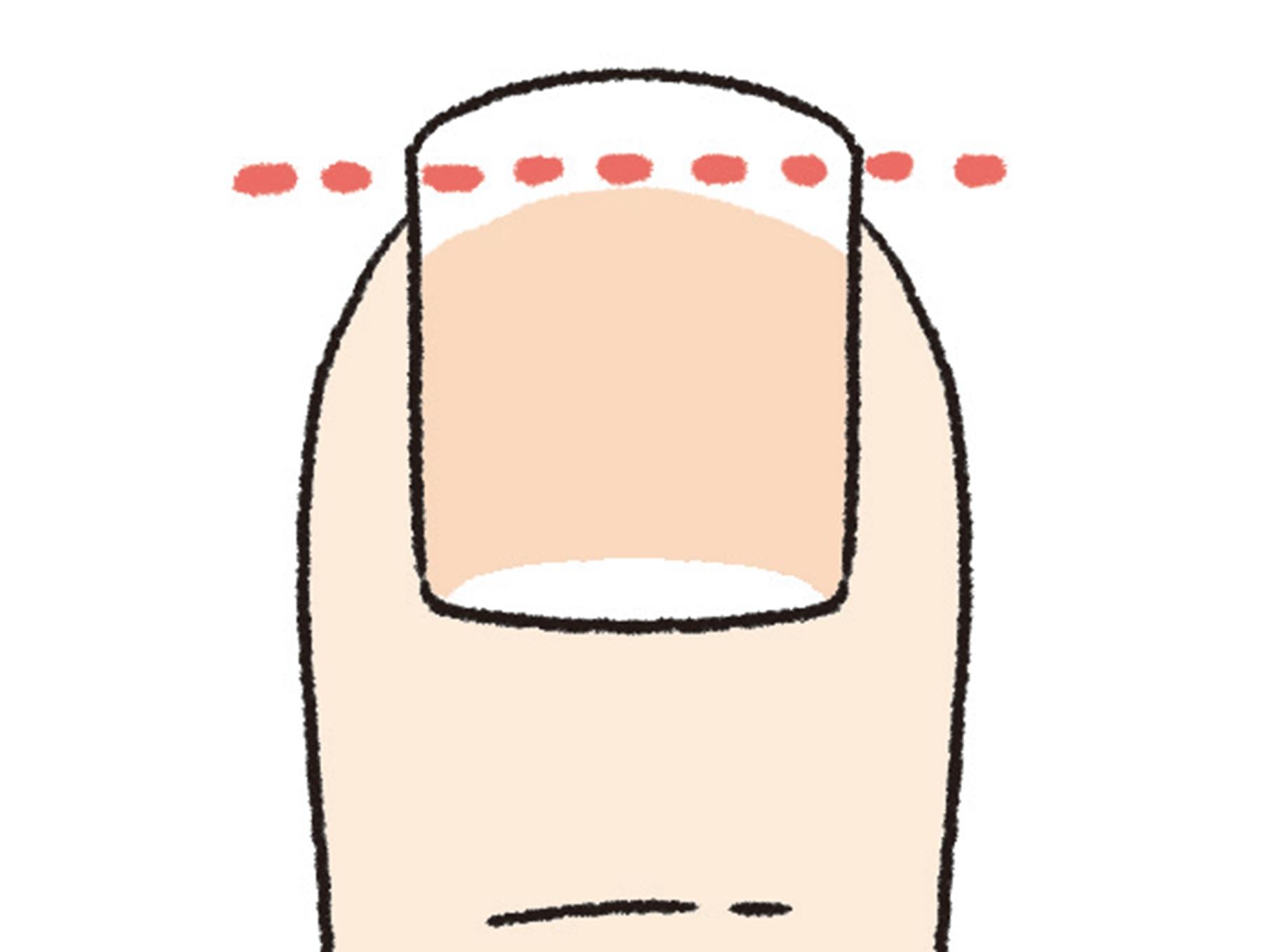 (1)まず、爪の上面をまっすぐに切って長さをカットする。指先を押したときに指先と爪の長さが揃うくらいになると良い。