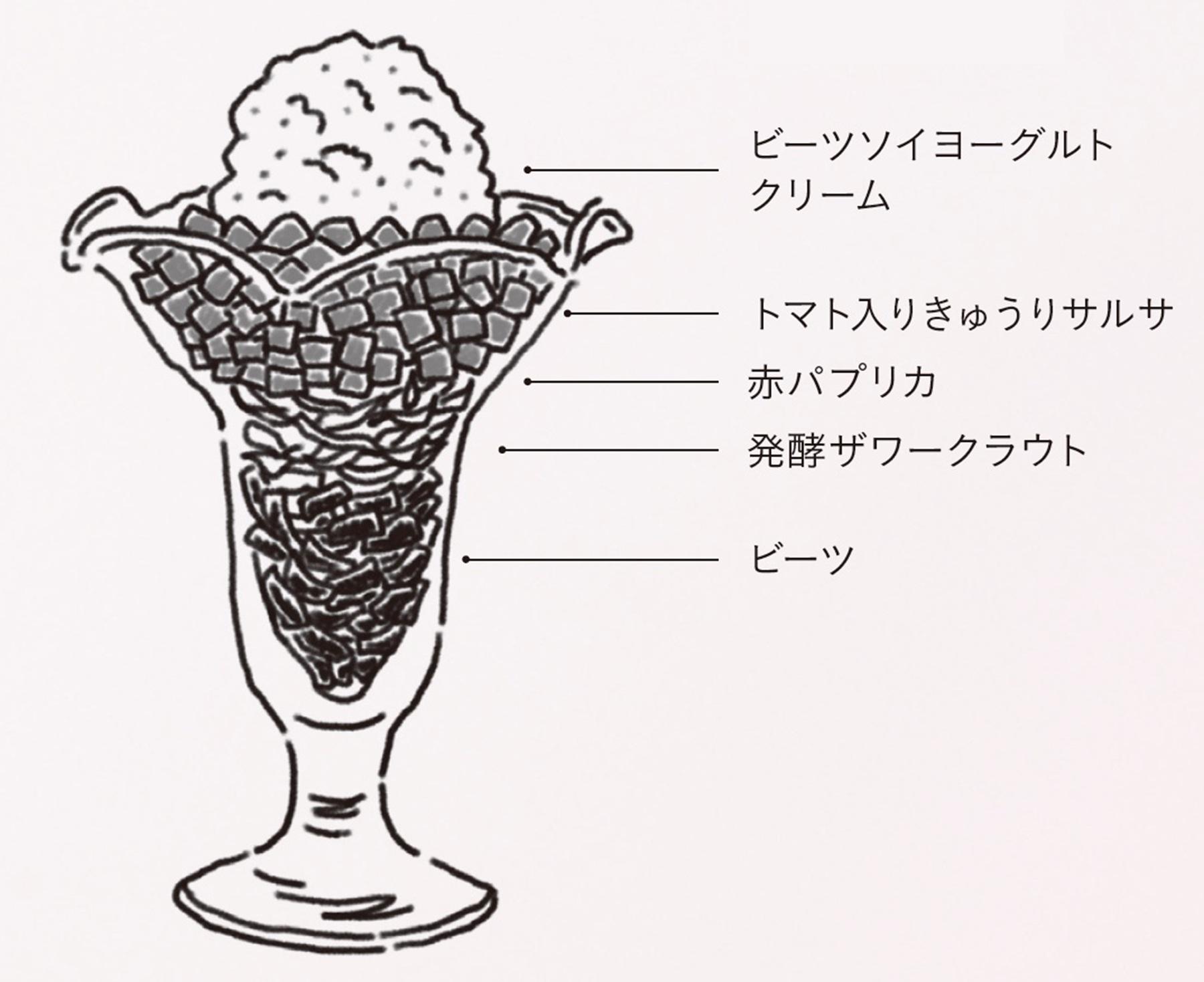「ベジパフェは、消化に時間がかかるタンパク質を下に、消化の早い野菜を上に重ね、上から順に食べることで内臓にやさしい構成になっています。サラダだと飽きてしまう野菜も、パフェ仕立てにすることで、見た目も気持ちも満足できるんです」