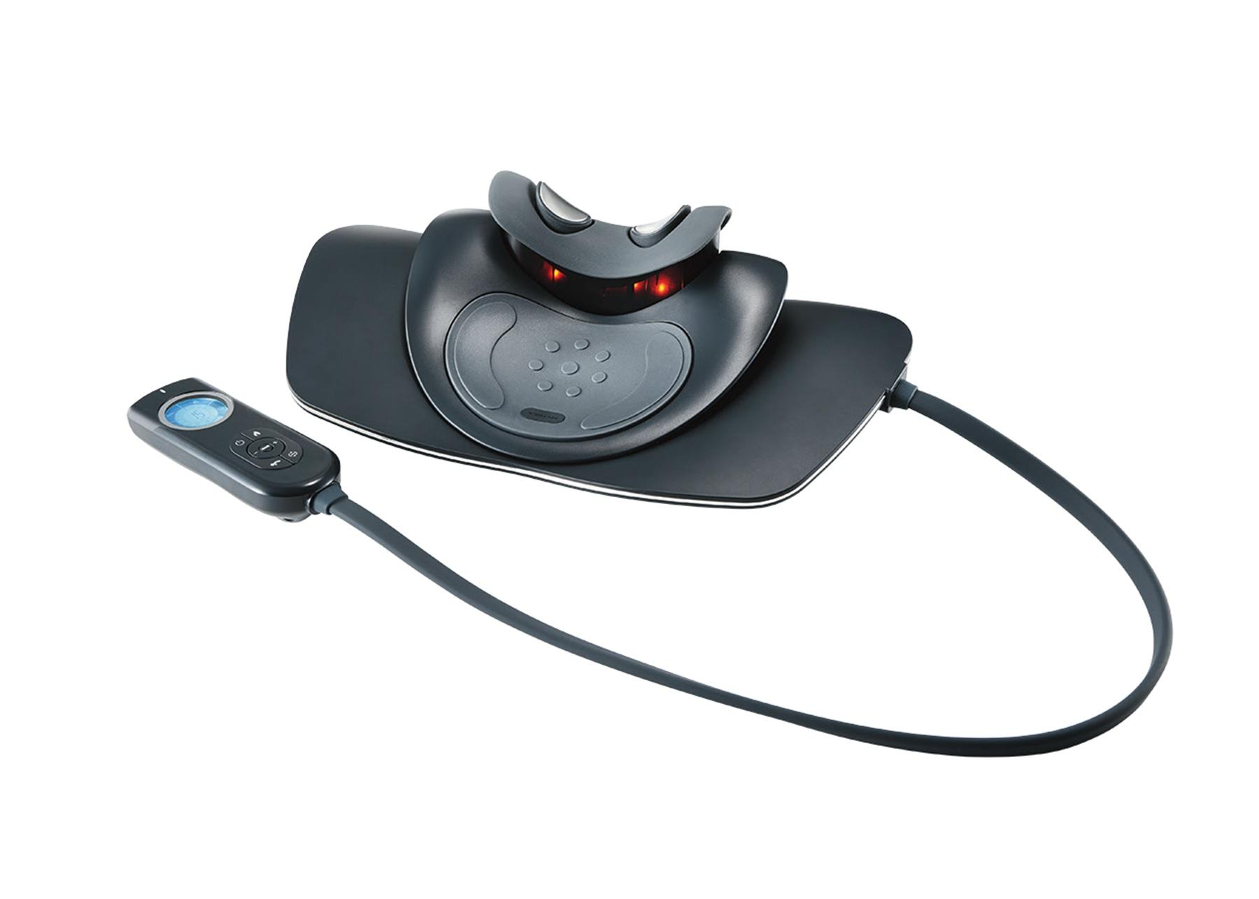 頭と首を乗せて寝るだけで本格的な首ケアが叶う、次世代ネックケアマシン。最大の特徴は、長時間のデスクワークやスマホの使用で真っすぐになった首を自然なアーチ状へとサポートする「牽引」機能。さらにEMSと温熱機能により、首の深部にアプローチしながら筋肉の緊張をほぐすことができる。¥27,500(MYTREX TEL:092・260・7366)