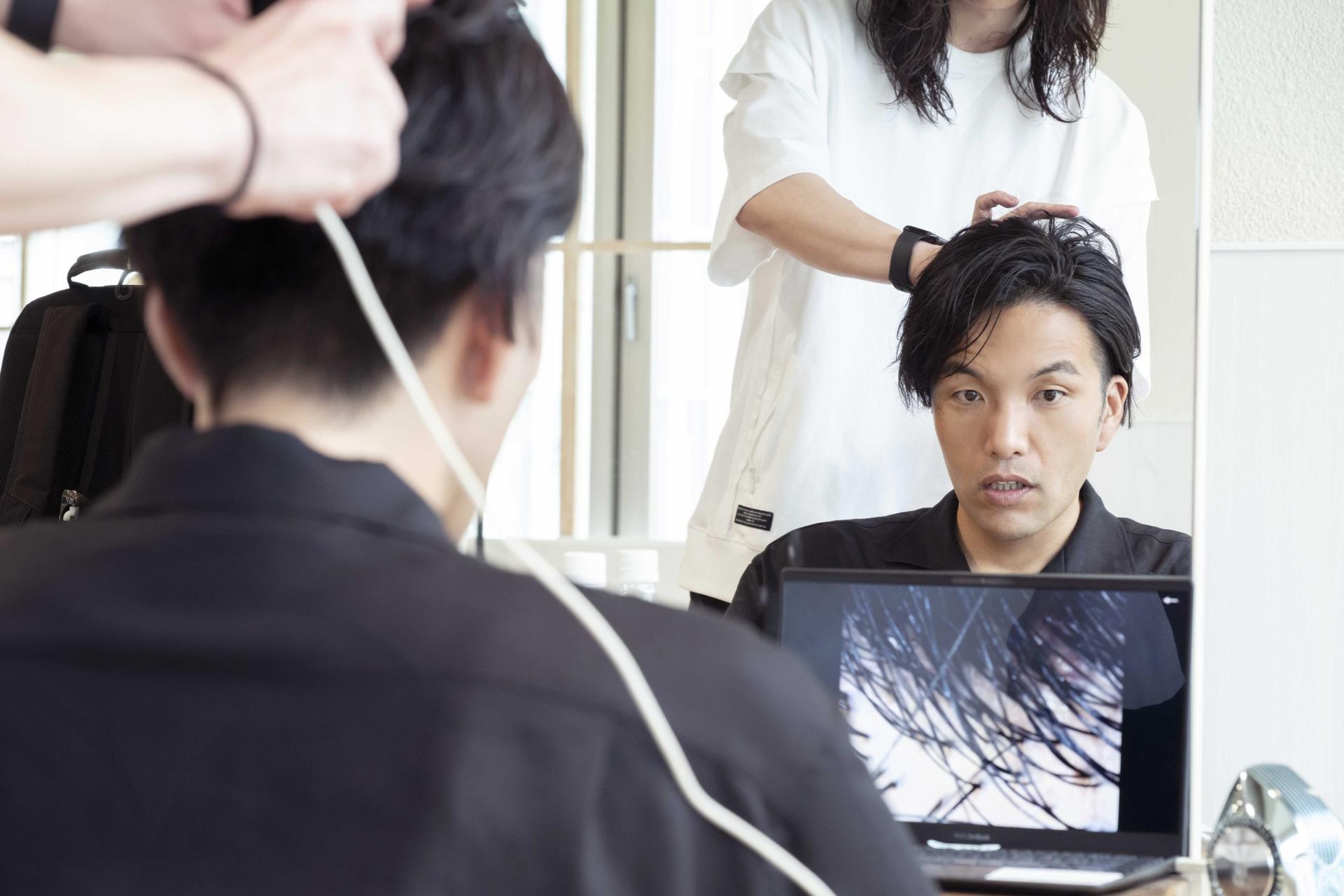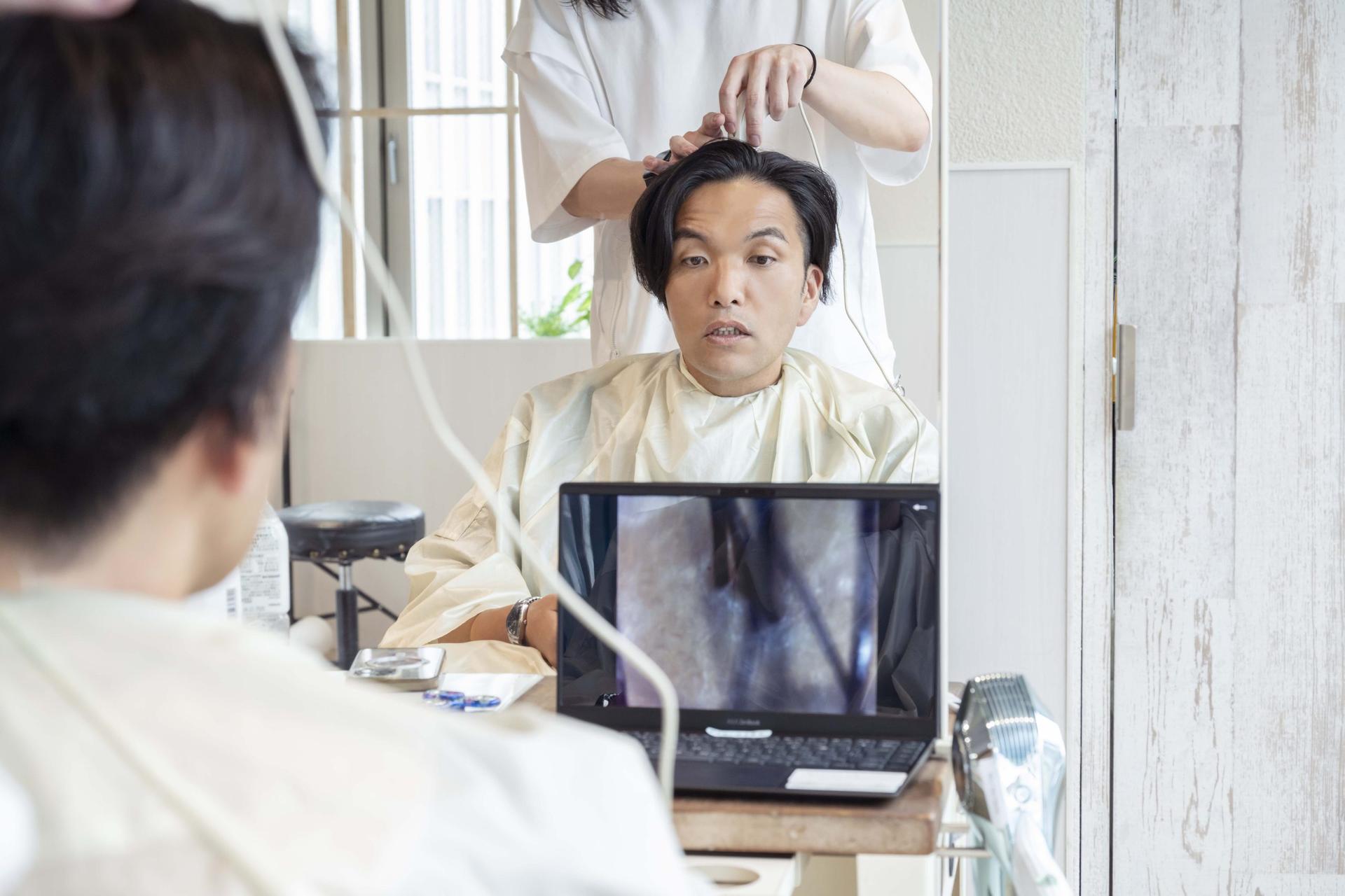 席に座るなり「表参道のおしゃれなお店。今日は痛くないですよね?」と丸腰の盛山さん。マイクロスコープによる頭皮の診断のあと、UVライトで頭皮の常在菌による代謝物、活性酸素を除去。「白髪や抜け毛対策にもなります」という説明に対し、盛山さんは「ハゲたくないです…。祖父はアジアで一番ハゲてるんです、ズルズルなんです」と切実ながらも笑いで返す。