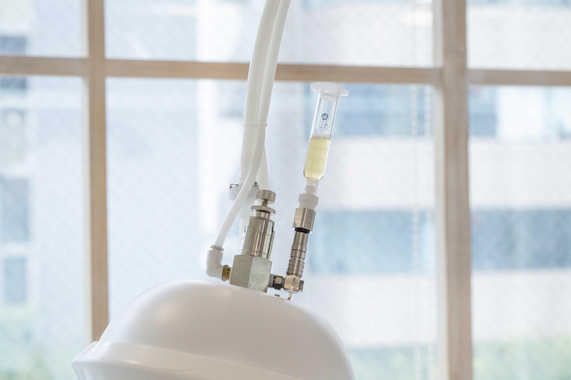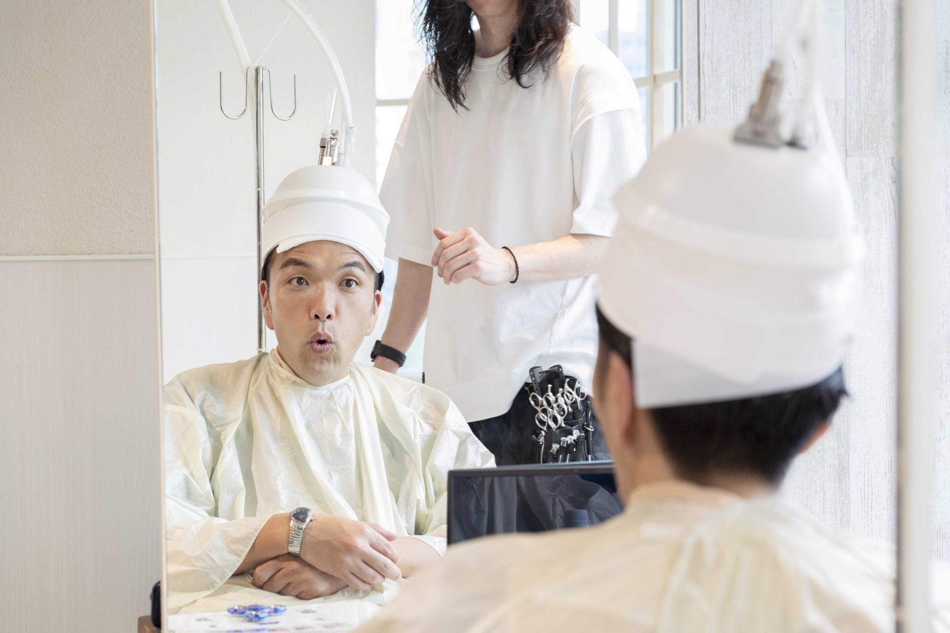 続いて、薬剤を使ったシャンプーやトリートメントが終わり「世界で一番気持ちいいシャンプーやったわ〜」とリラックスする盛山さんに、いよいよ“真空含浸装置”を装着。「俺の記憶を吸い取ろうとしてます?」と戸惑いを見せつつ、加圧と減圧を繰り返してキャップを外すと「サウナの外気浴みたいで気持ちいい! 整いました」と満足げ。顔色も明るくなったよう。