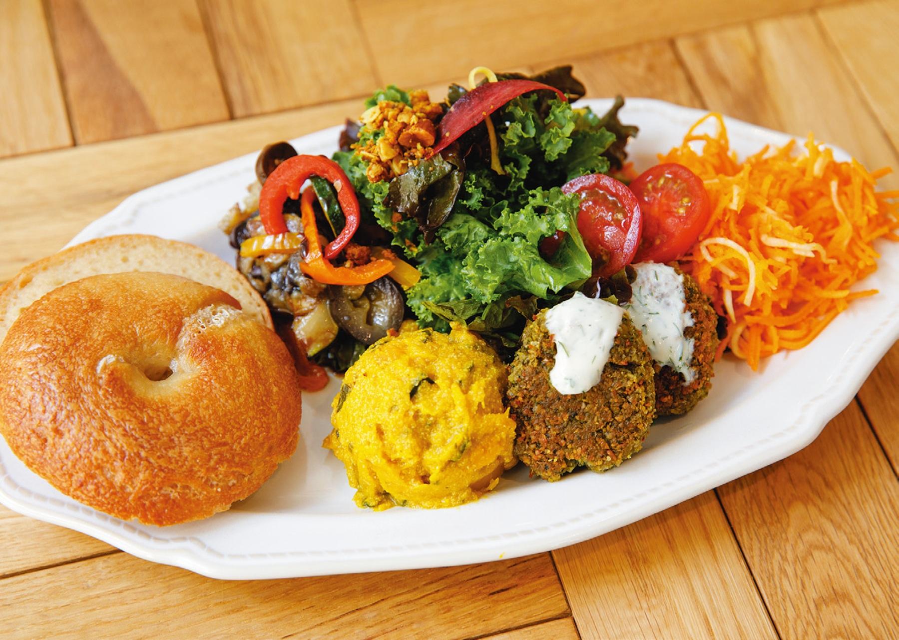 店に入ると、ヴィーガン&グルテンフリーのクッキーやマフィン、ケーキがお出迎え。四万十川源流で育ったお米、JAS認証のオートミールやアガベシロップなど素材にはとことんこだわる。実は、スタッフの約半数はヴィーガンではないそう。「だからこそ、ヴィーガンの勉強はしていますが、“ちゃんと美味しい”ことを追求しています」と店長。もっちりした米粉のベーグルかブレッドを選べるブランチプレートデリ4種(¥1,600)は、素材の味を活かしながらスパイスを巧みに使い、4種類の中で味の強弱をつけることで、野菜だけでも十分満足感のある一皿に。“実り”をテーマにした店内も木の什器が温かみを醸し出し、居心地がいい。